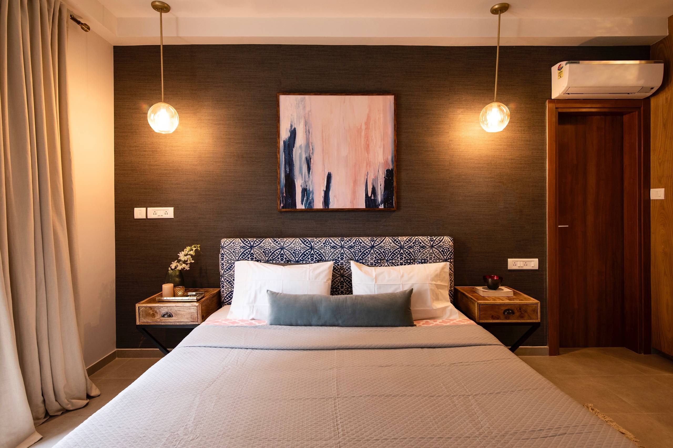 The master bedroom has a cool, soothing scheme, where dark tones are offset with light furnishings. “The colour palette is predominantly grey and blue, with a sprinkling of blush,” Vinithra says. “The upholstered bed is custom-made with a hand-embroidered fabric in shades of blue, anchored by a charcoal seagrass wallpaper.”