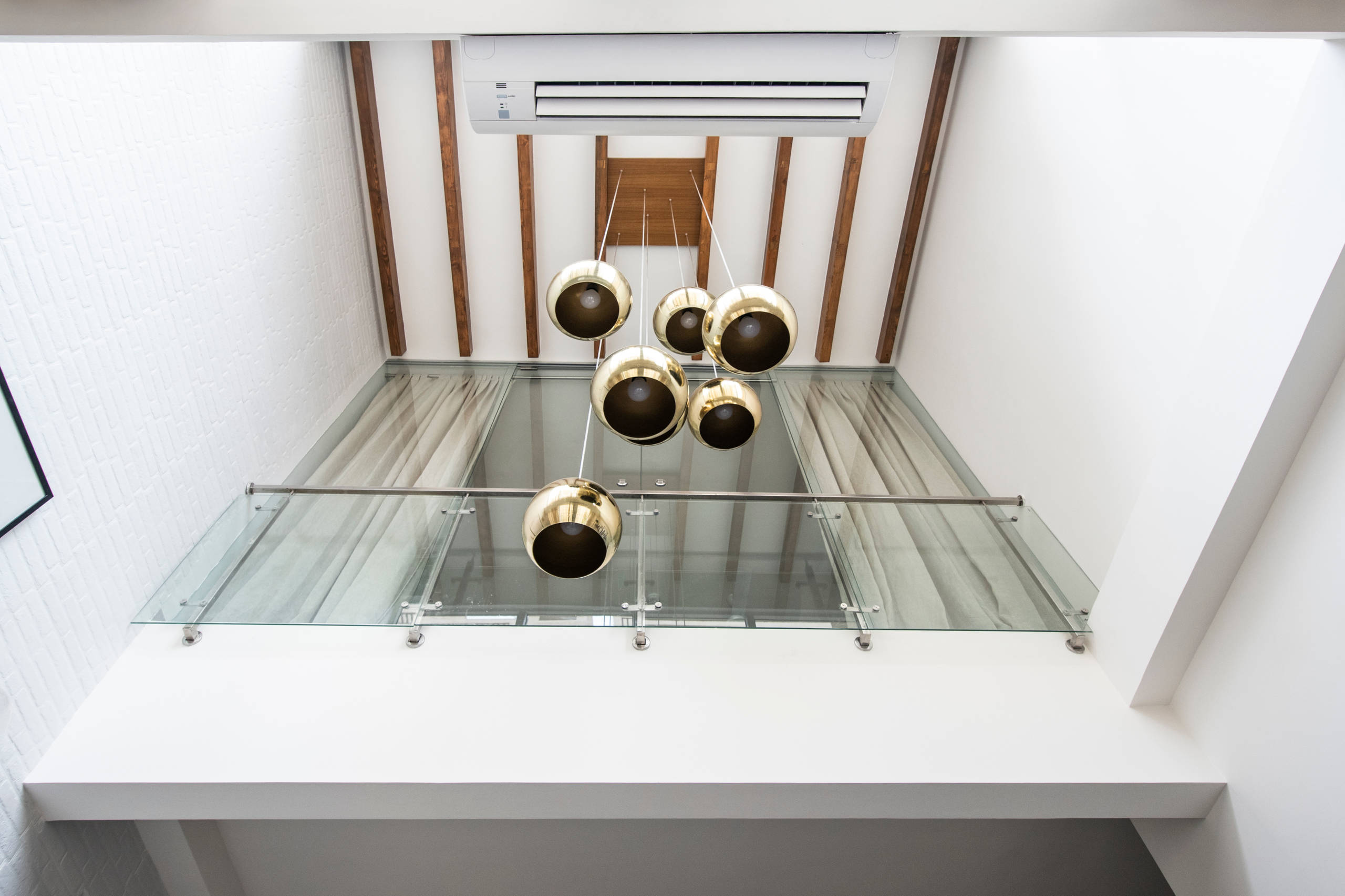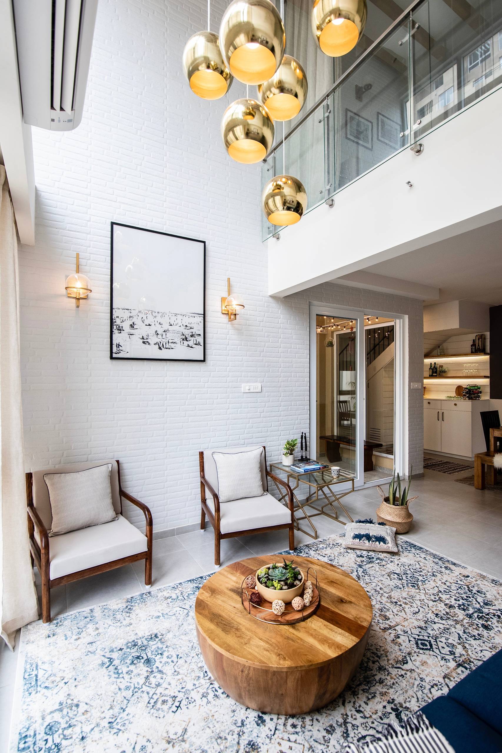 The natural wood rafters on the ceiling and the white brick walls lend warmth and an inviting feeling to the room. “The space is complemented by a custom-made light fixture of hanging gold pendants,” Vinithra says.