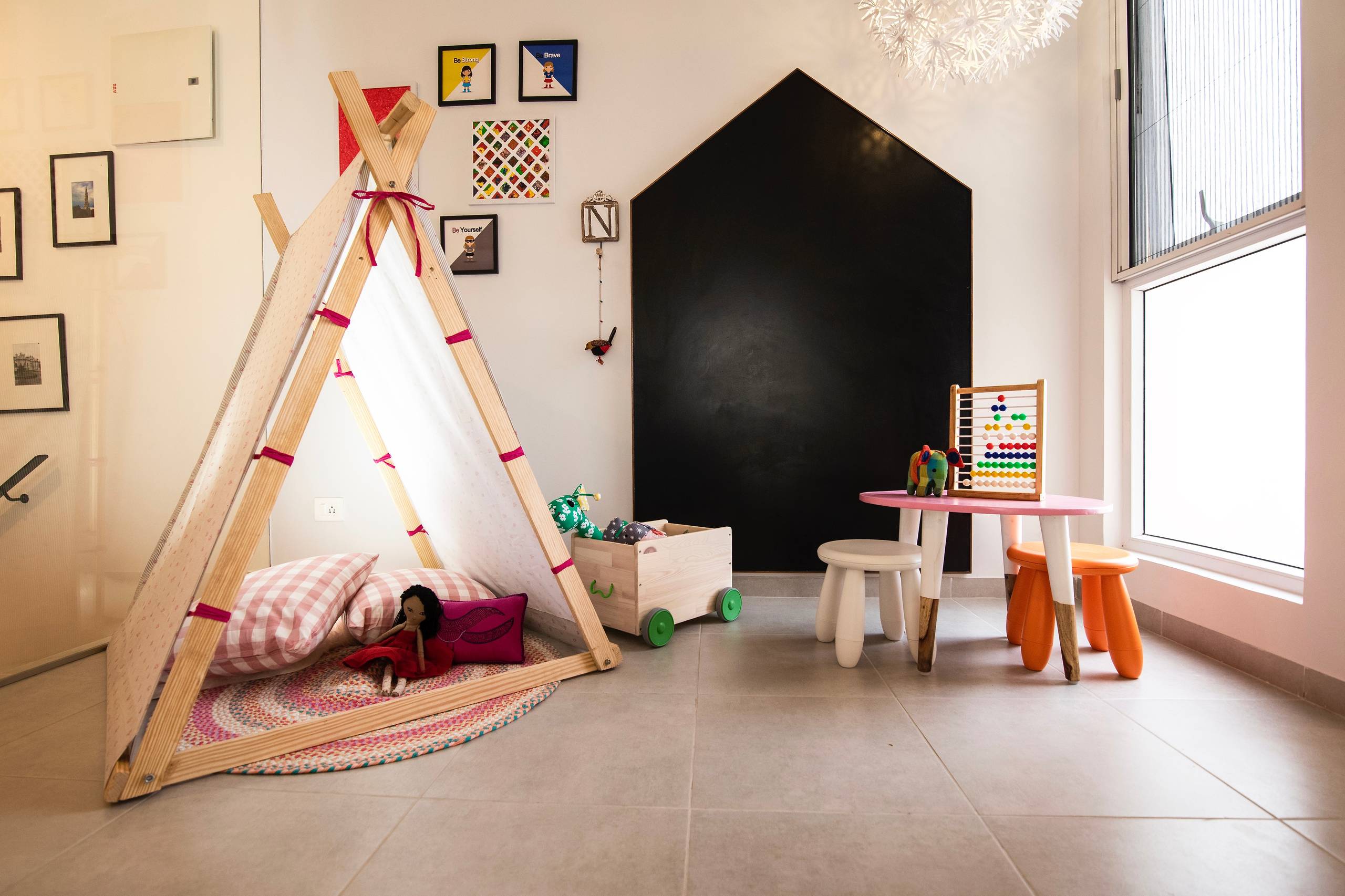 In one corner of the room is a play area, enhanced with a tent, a blackboard and a small table with stools for all those arts-and-crafts afternoons.