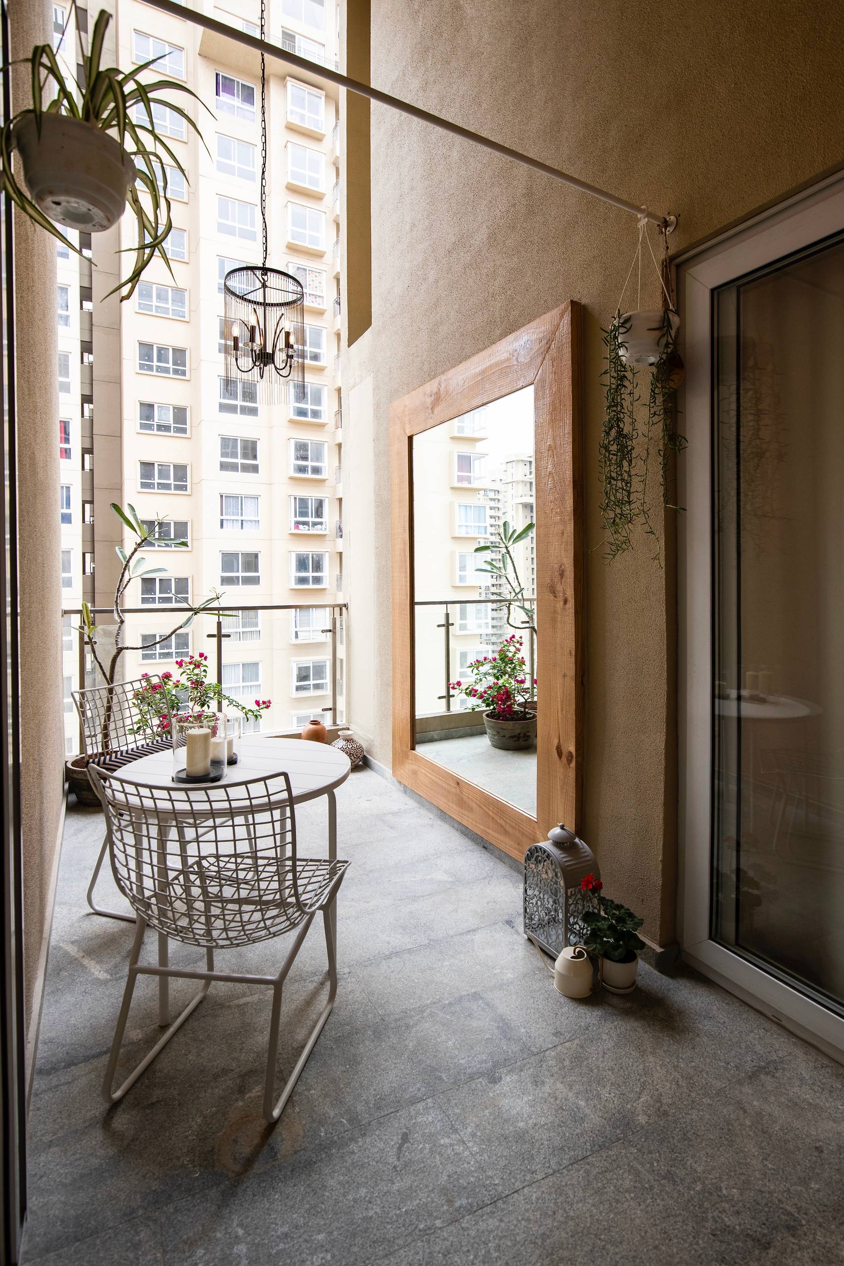 “Given it’s a tight spot, we decided to add an oversized mirror on one side,” Vinithra explains. “This mirror is framed in recycled wood, giving the space a rustic chic feel, perfect for the outdoors,”