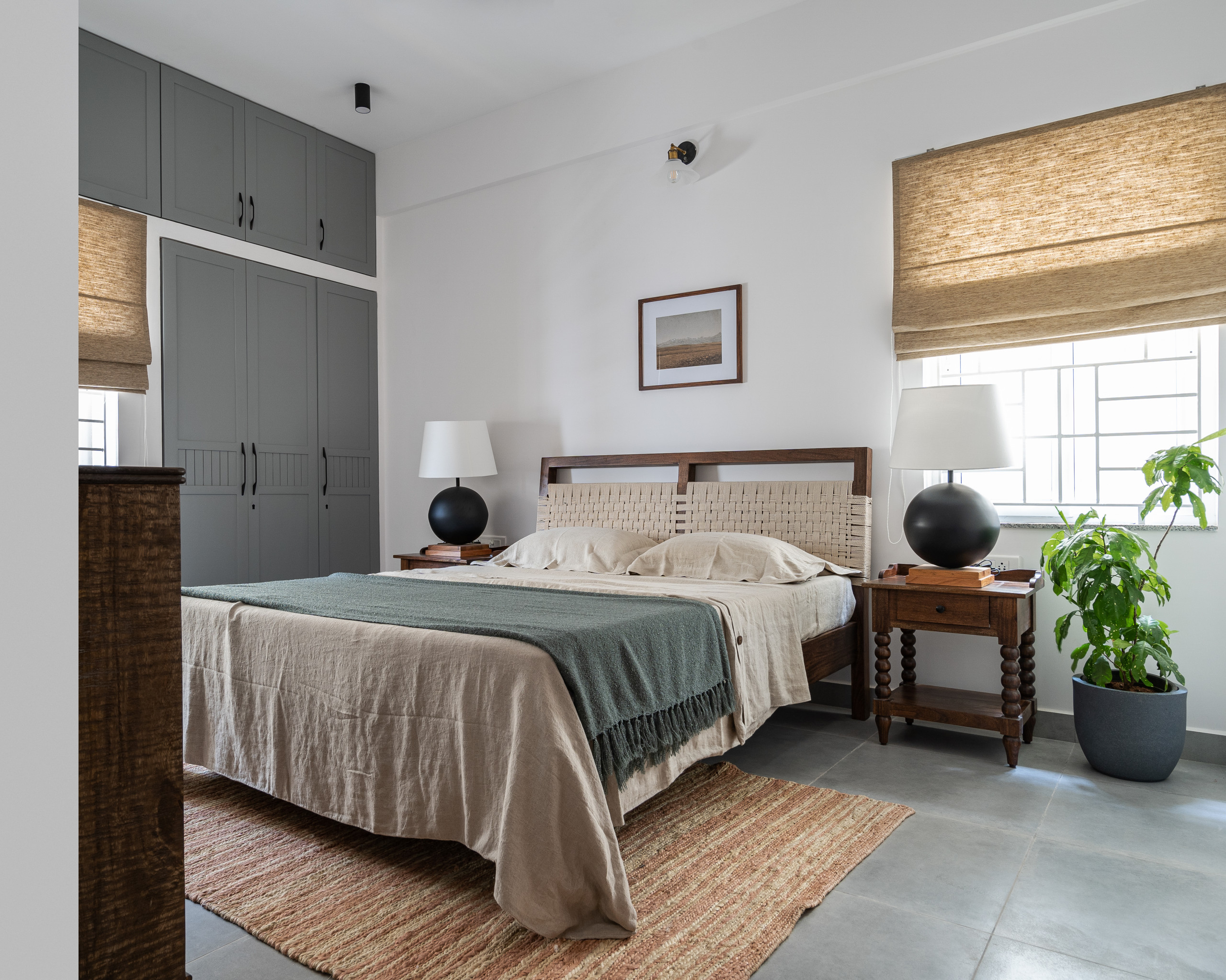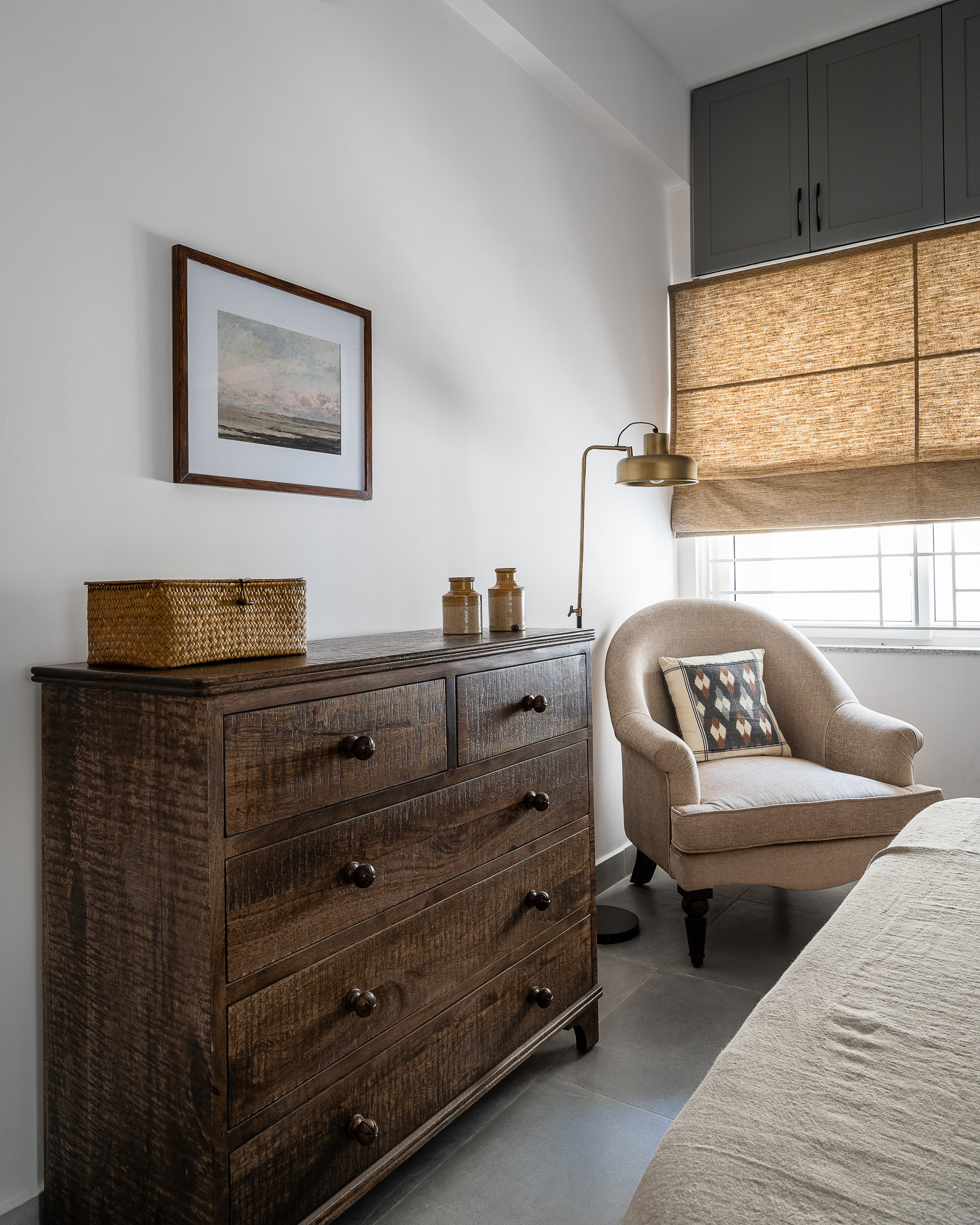 “A custom-made wooden bed with a woven headboard gives an organic touch to the guest bedroom,” Sunita says. “Traditional [bedside tables] flanked by modern round black table lamps and a vintage-looking chest of drawers for storage set up a layered vignette.”