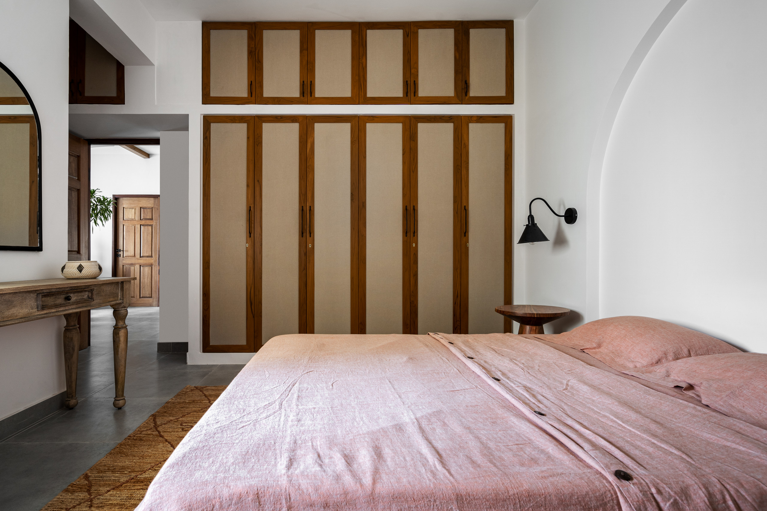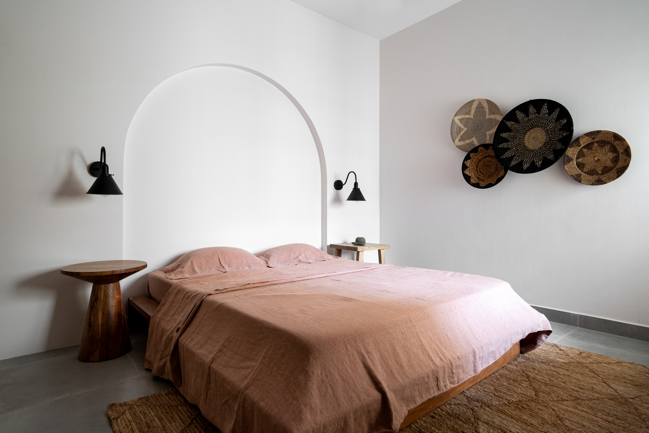 The master bedroom has a Moroccan retreat vibe while being minimal and functional. A niche arch frames the low-platform bed and doubles as a headboard.