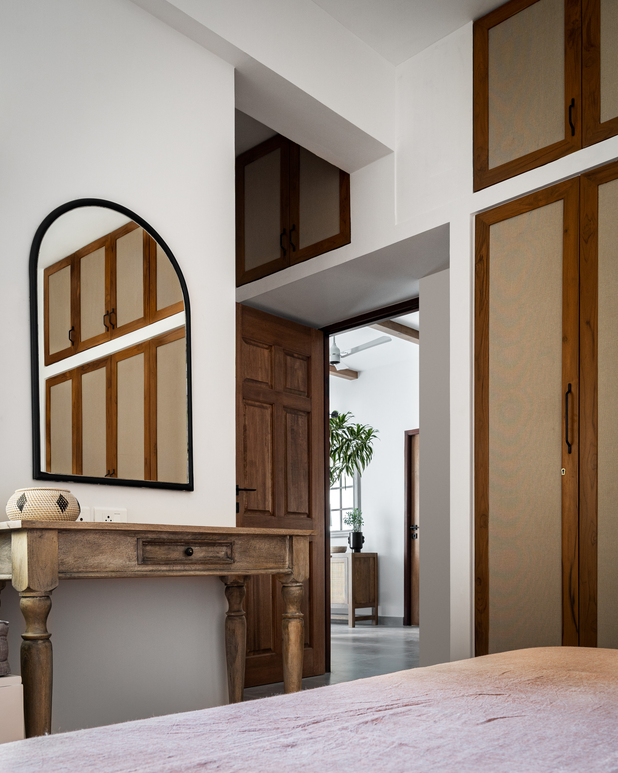 Teak-framed fabric wardrobe doors and a distressed table add texture and underpin the vintage feel. Tucked away above the door is built-in storage.