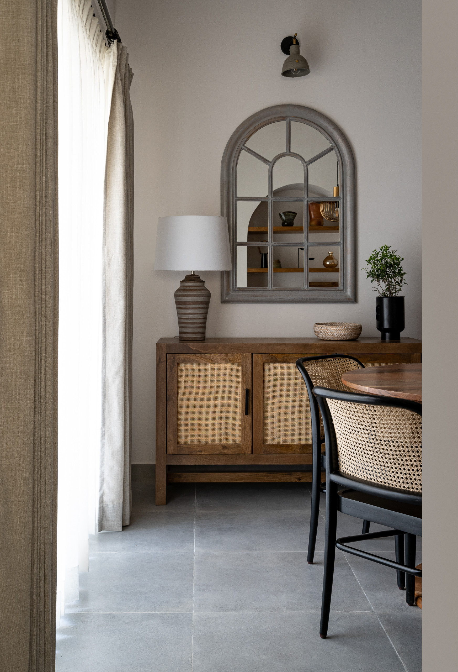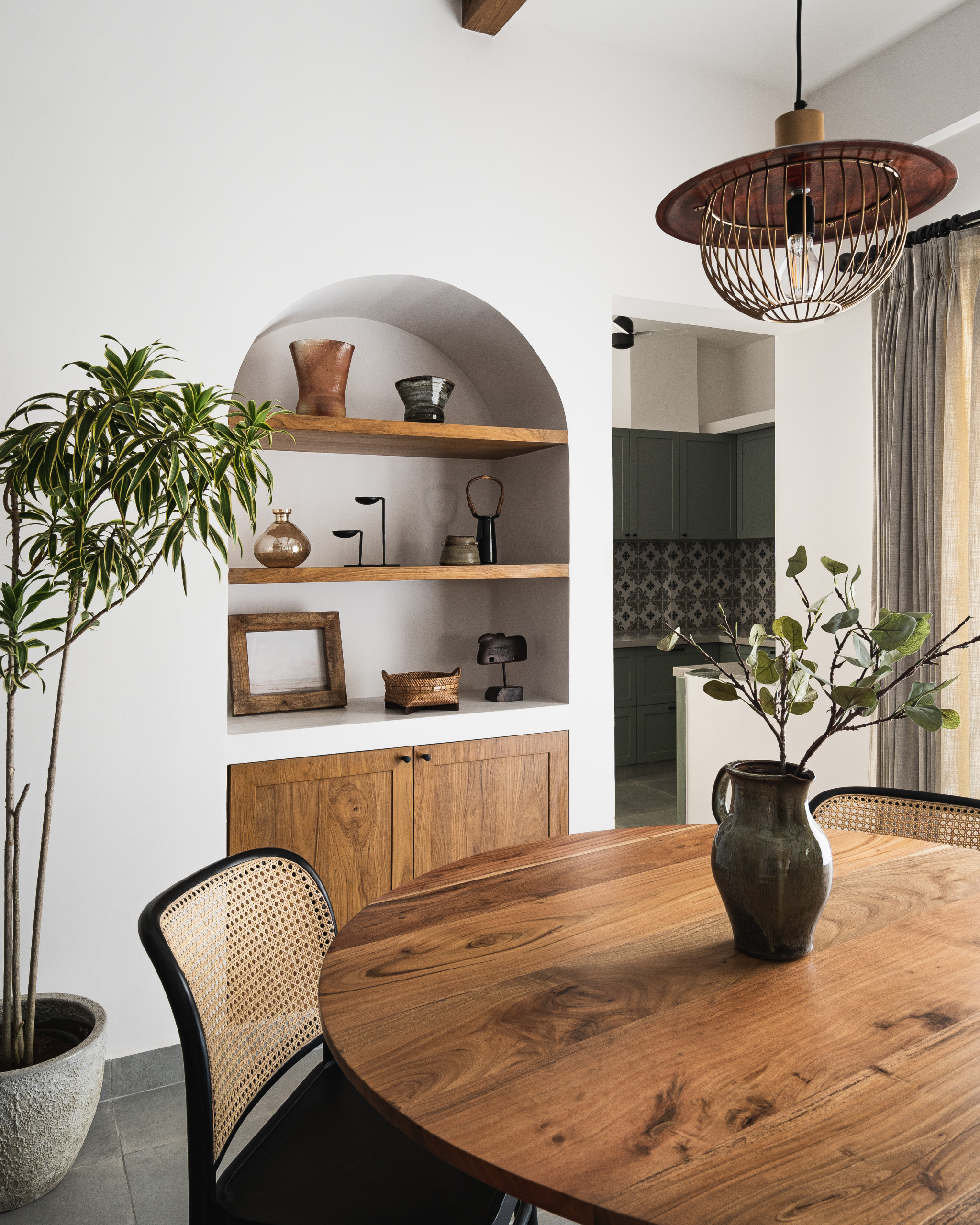 A Moroccan-inspired alcove, with an arched window and a sideboard with woven rattan shutters, lends oodles of character to the dining room.