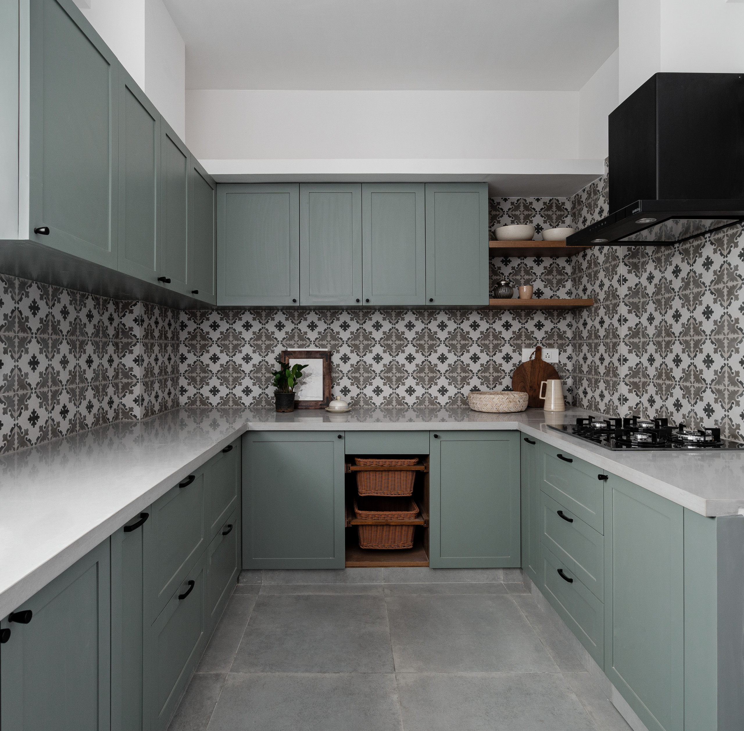 Moroccan-style patterned tiled splashback lifts the muted sage-green tones of the cabinets and grey quartz worktop in the galley kitchen. Niches above the cabinets offer extra storage.