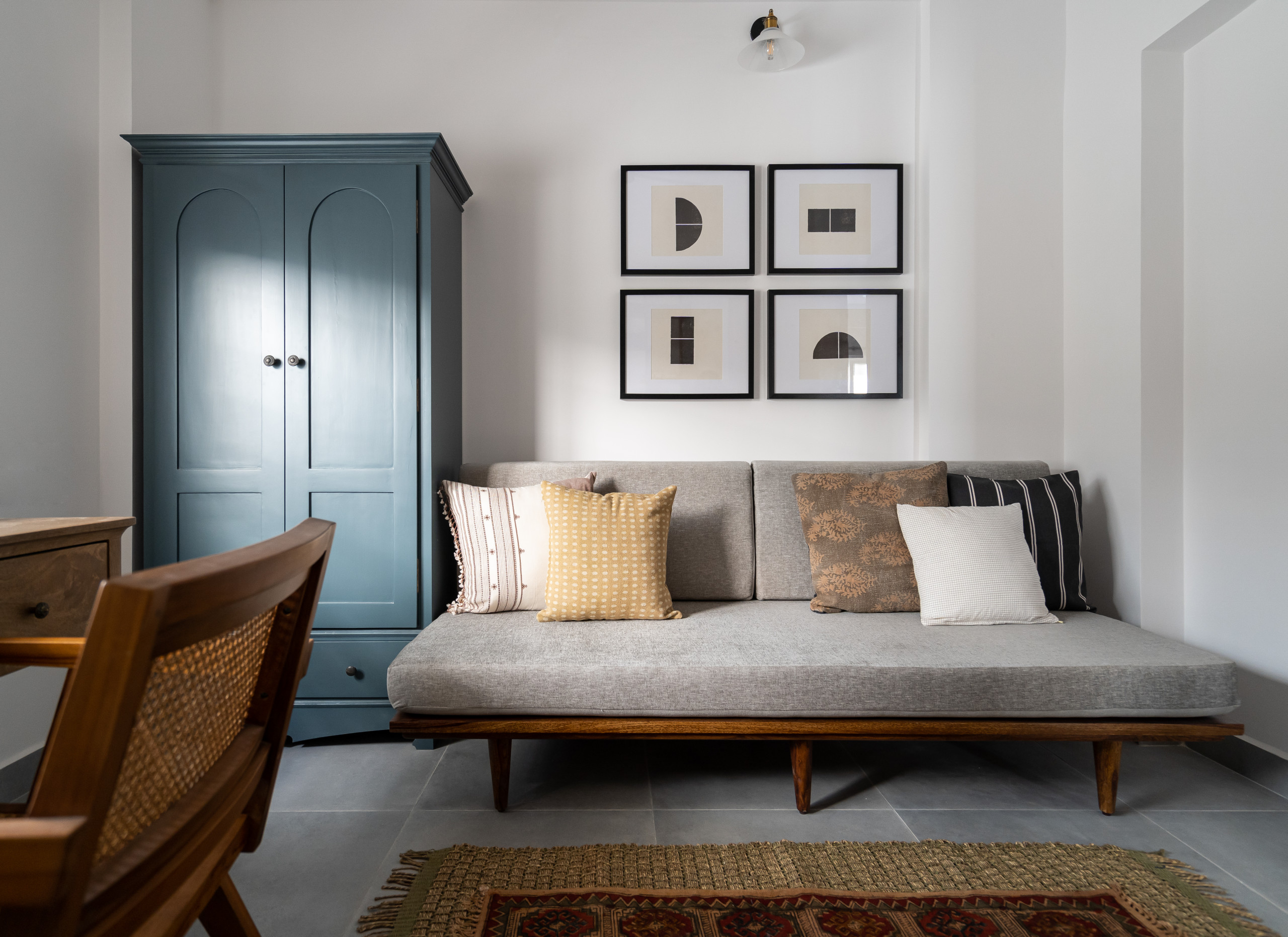 The designer converted the third bedroom into a home office with a clutter-free design scheme. A slate-grey vintage cupboard complements the monochrome artwork and neutral daybed.