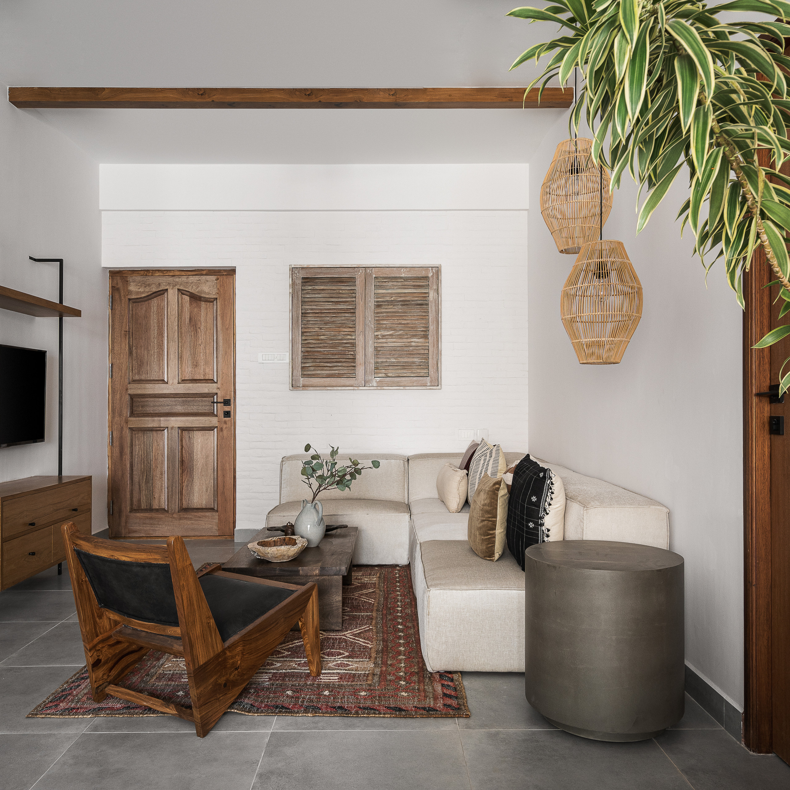 Designing a living area with a narrow profile was challenging. Sunita tackled this by using wooden beams on the ceiling, giving depth to the space.