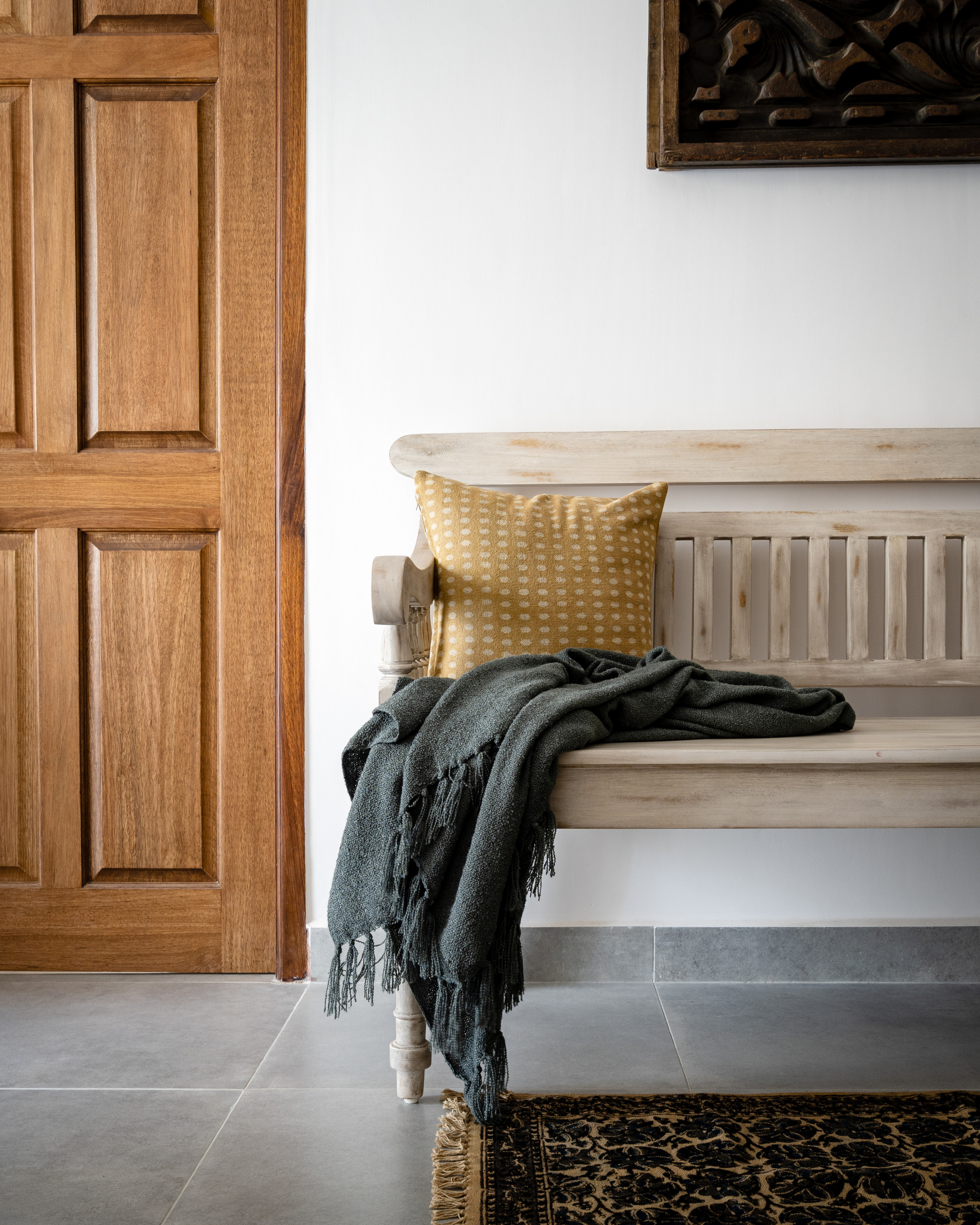 Placed near the living area, a carved wooden bench offers seating and punctuates this spot with old-world charm.