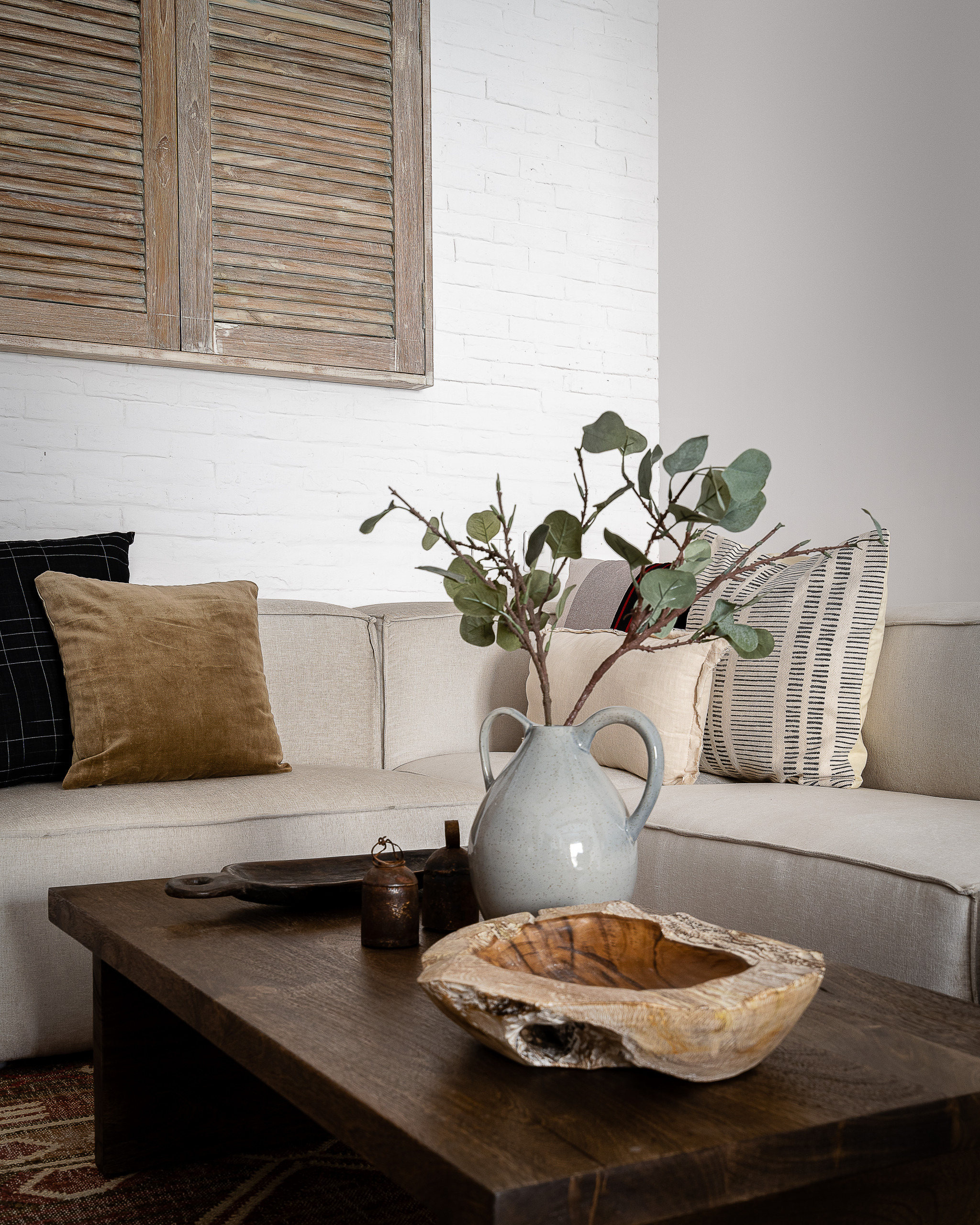 A modular sofa sits against a brick accent wall. It gives the living room a streamlined look inspired by wabi-sabi, with a pared-down palette of materials and organic touches.
