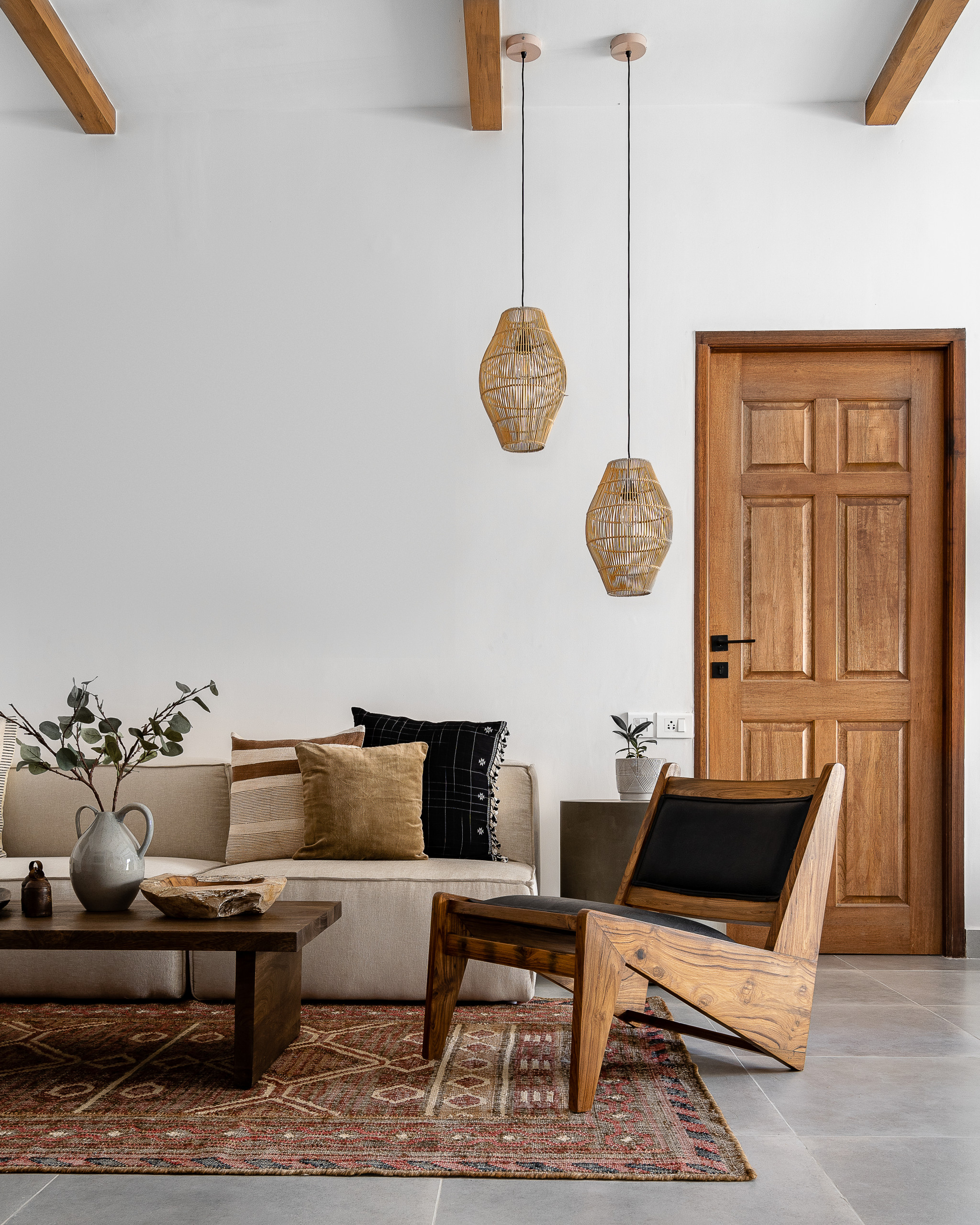Natural wood furniture takes centre stage in the living space, with a rustic coffee table, a Pierre Jeanneret Kangaroo chair and a shabby-chic louvred window (see previous photo). Bamboo pendant lights and a concrete end table lend a whimsical touch to the décor.