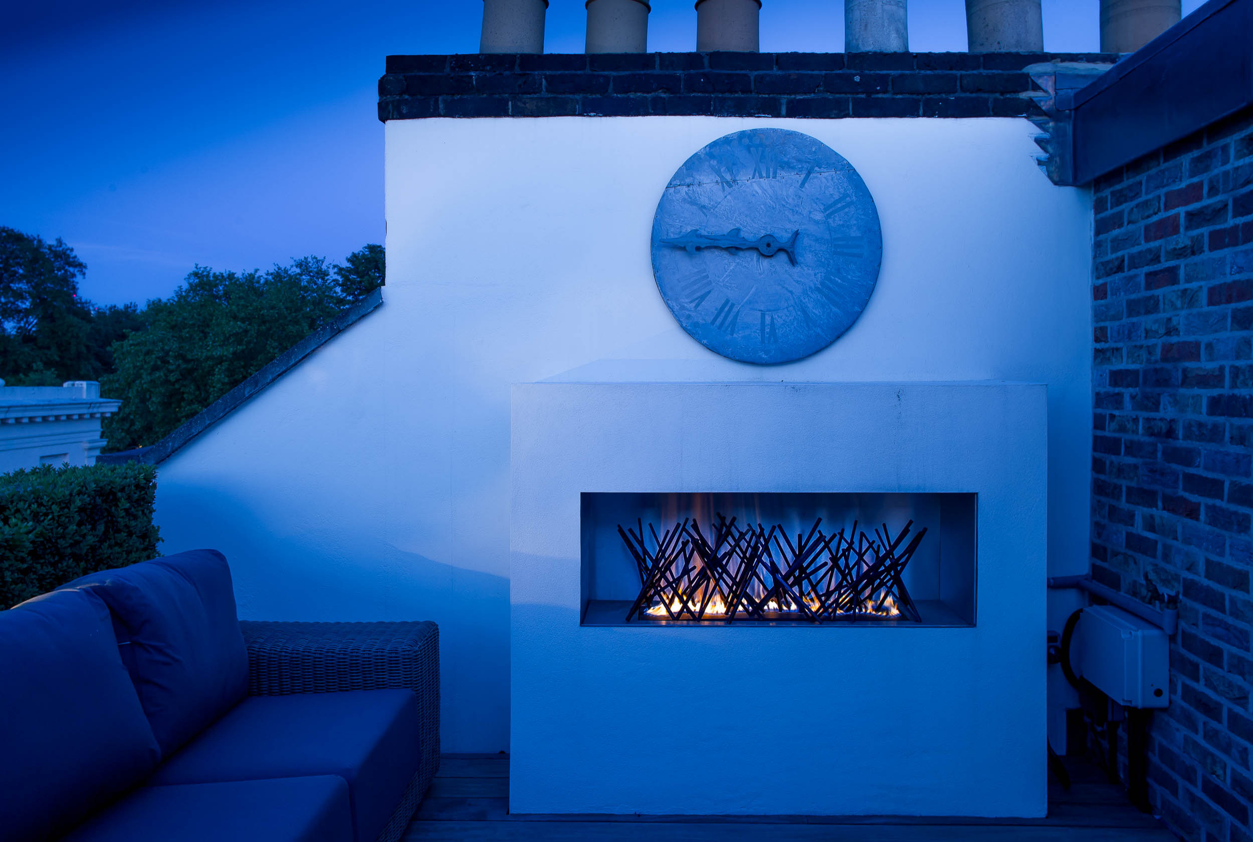 Even roof terraces and tiny patios can have their own fireplaces. This gas fire creates a chic and inviting space for entertaining, and the funky design adds to the appeal, with the evening light casting shadows across the white wall.