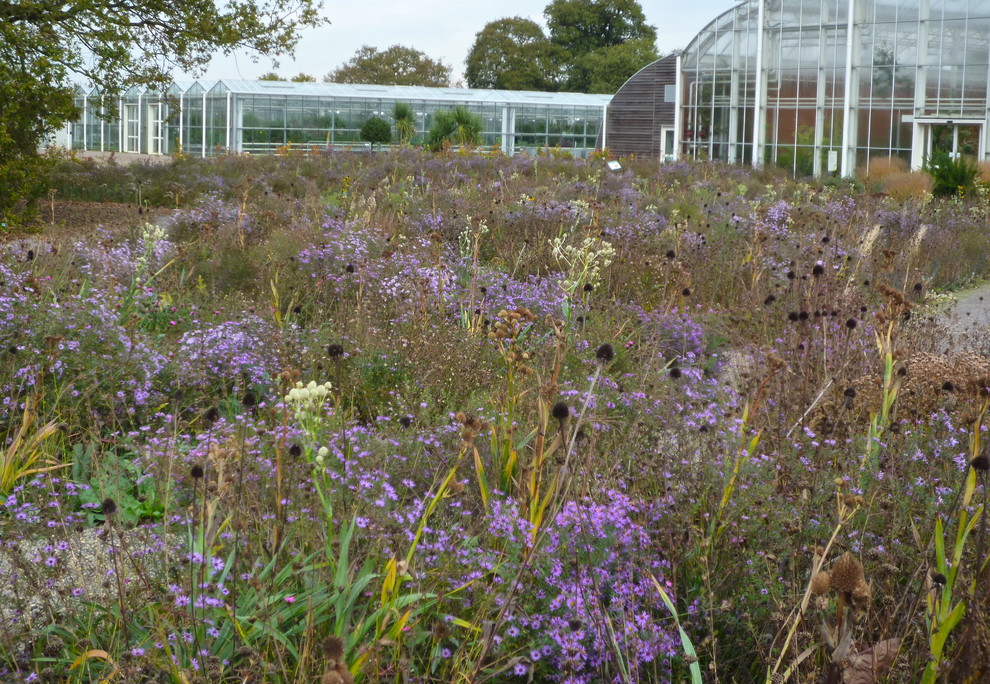 A garden in the autumn can look bare and uninteresting, but if you leave the seedheads on and the grasses long, like here at RHS Garden Wisley, then the season will carry on well into the winter months. Allium seedheads can be seen here between the asters and grasses.