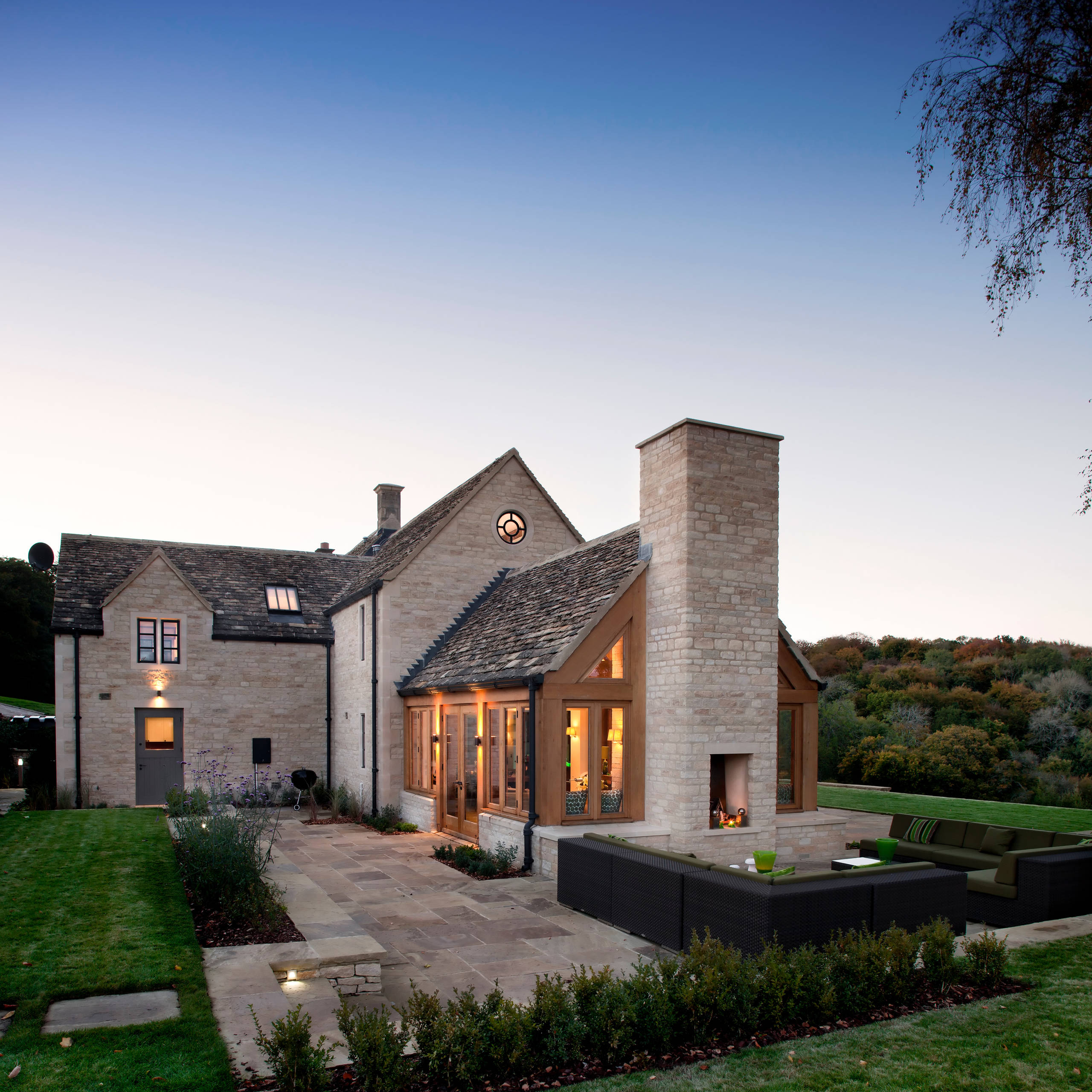 A built-in fireplace makes keeping warm outside easy. This tall Cotswold stone fireplace and chimney on the end of the oak-framed extension helps create a wonderful outdoor living room that can be enjoyed on cool summer evenings and well into the autumn – or even winter – months. The fireplace becomes a central feature for the seating as it would inside the house.