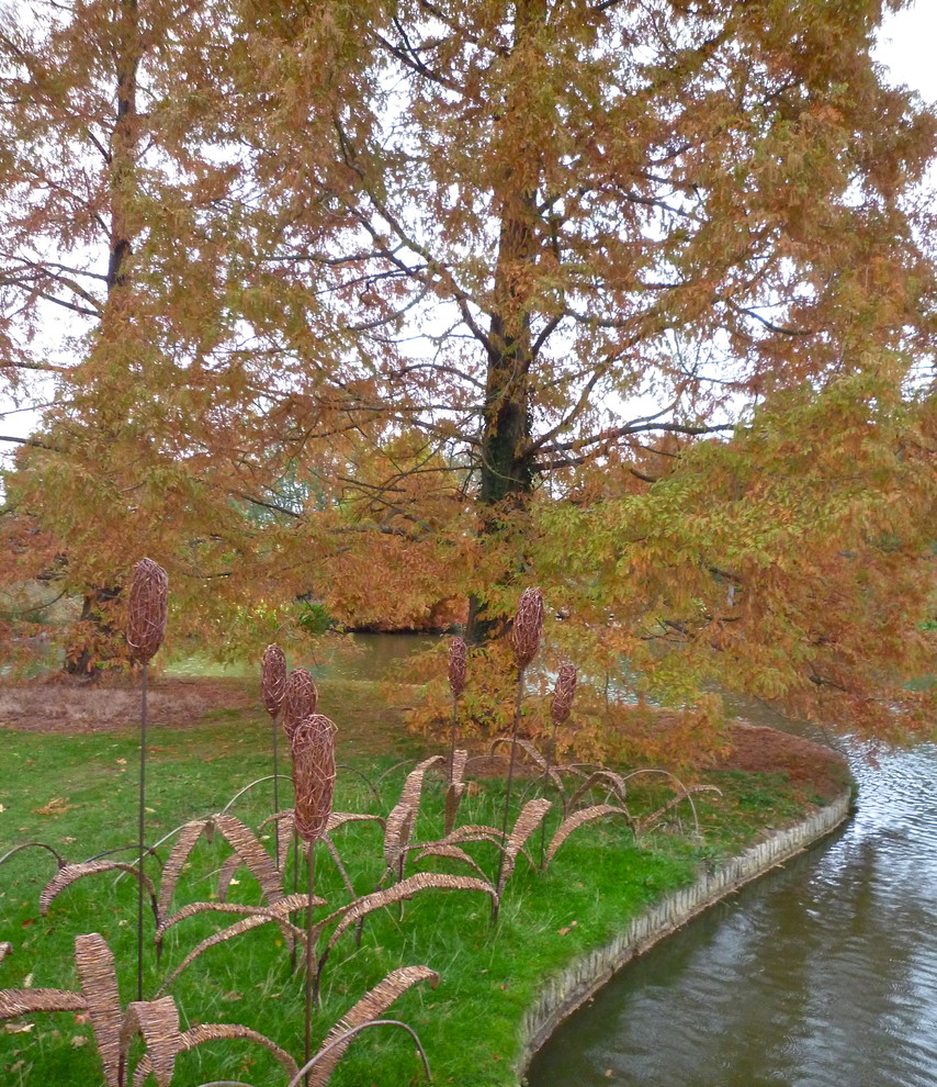 These bullrush sculptures on a plain area of lawn at RHS Garden Wisley are simple but effective, and quite at home under the arching layers of the lovely Liquidambar trees.
