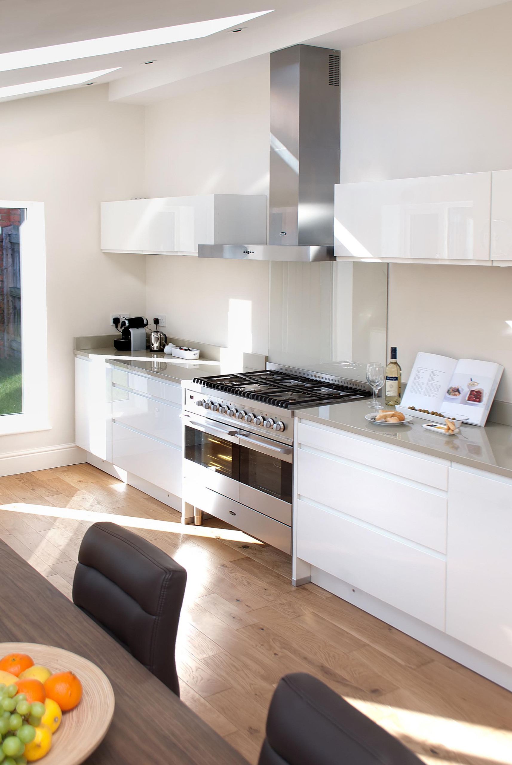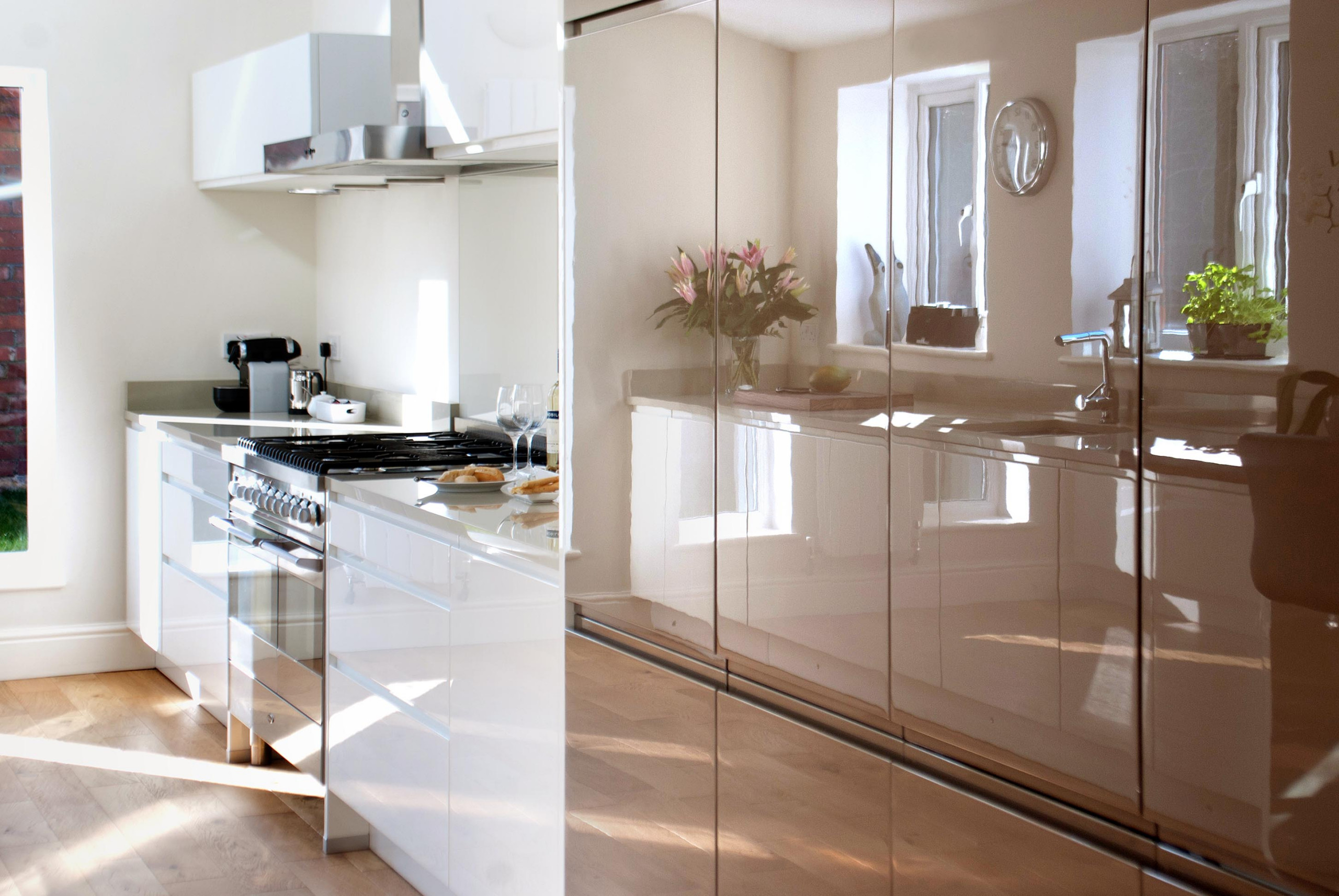 The German high-gloss handleless cabinetry, available through in-toto, reflects the light coming in from the skylights to further boost the brightness. The beige-grey high-gloss unit houses the fridge, a larder and plenty of storage.