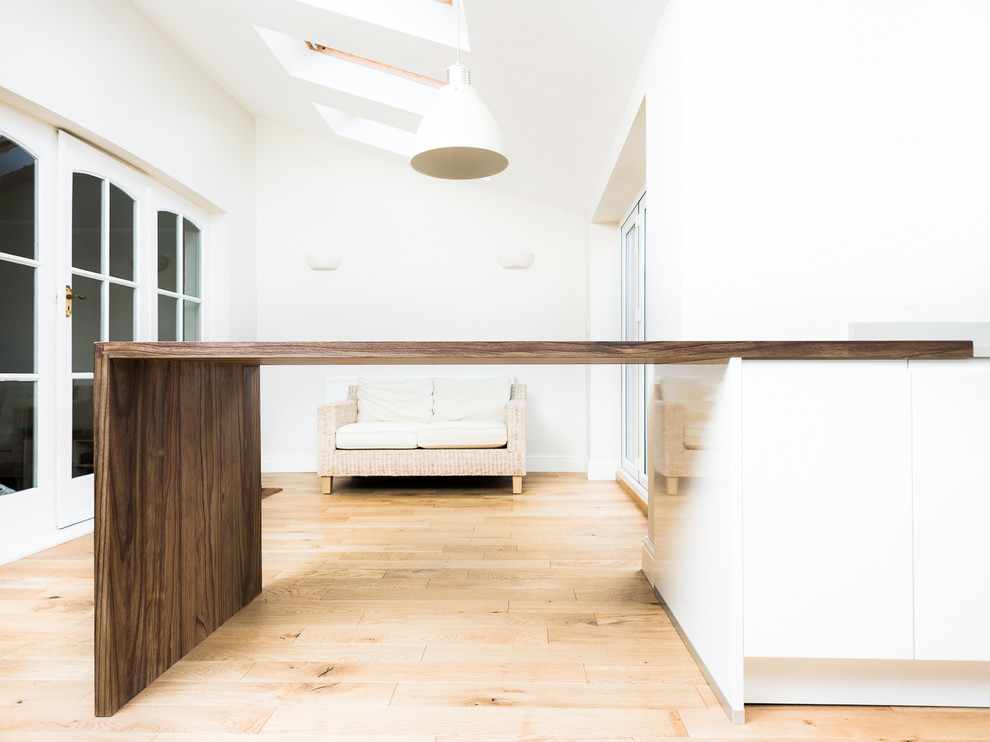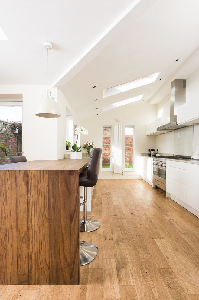 When John’s clients bought this 1930s property in 2013, they realised the home was too small for their needs, and decided to create a modern kitchen in a bright new extension. However, the extension’s pitched roof, which was an elemental part of the extension to conserve the building’s aesthetic, created a bit of a challenge. ‘To get lighting into that space was actually quite difficult,’ John says.