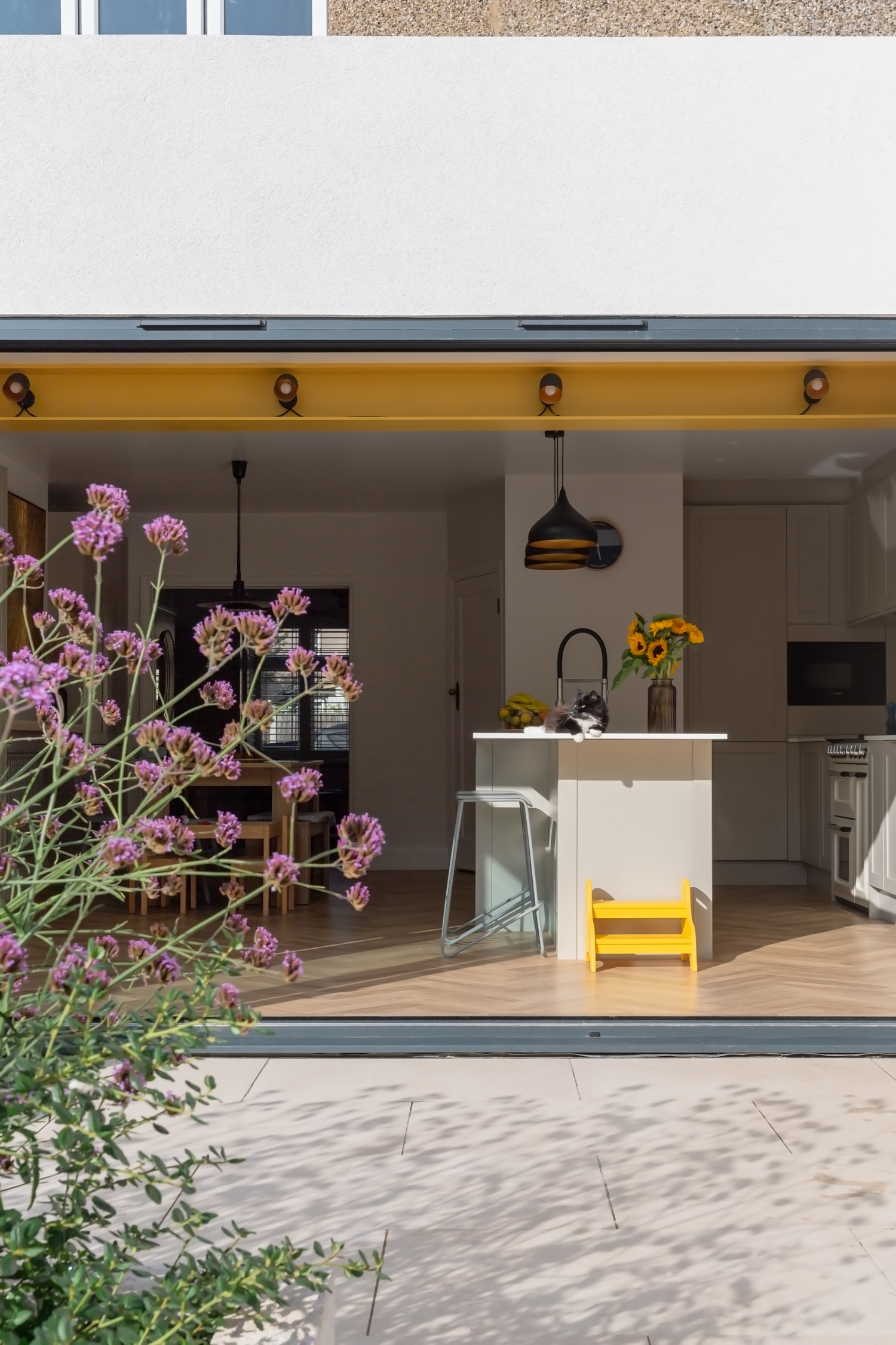 The living room at the front of the house gets the evening light, so John widened the opening between the rooms and fitted glazed double doors to allow the kitchen-diner to benefit.