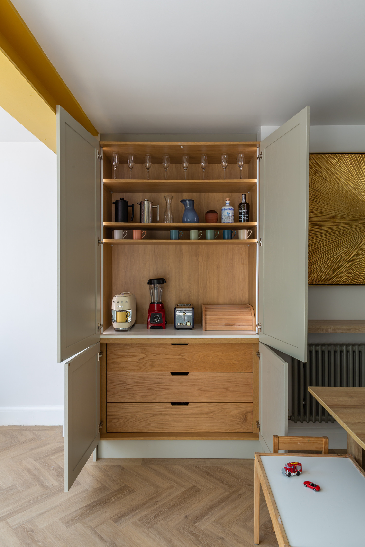 On the opposite side of the room, double pantry cupboards in the chimney breast alcoves add yet more storage. The cupboard on the right is full of toys at this stage, while the one on the left is John’s favourite feature…