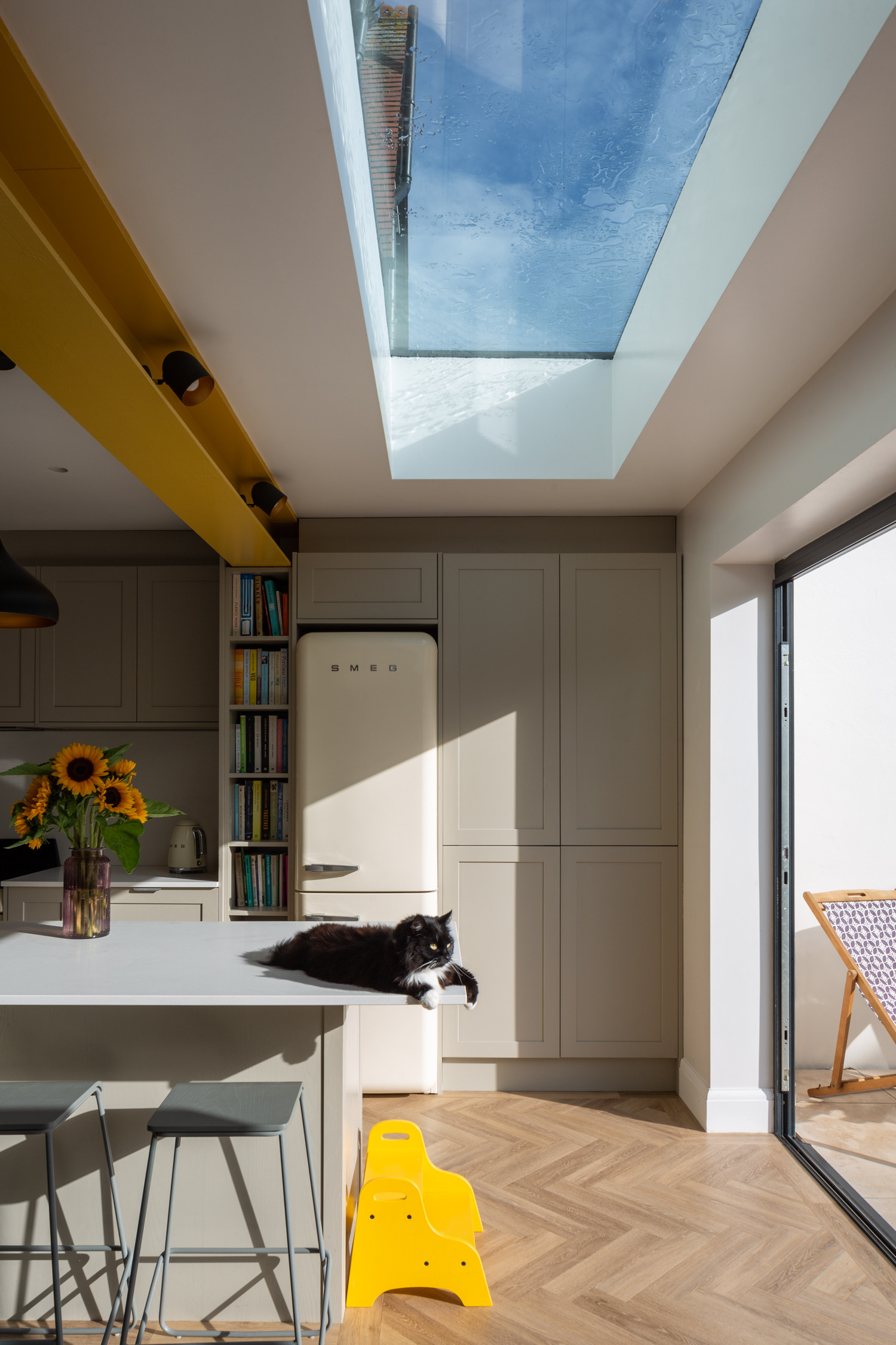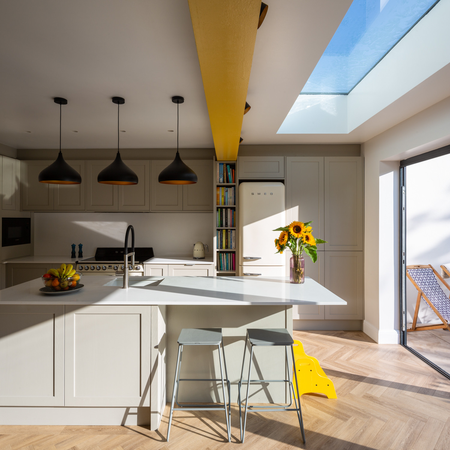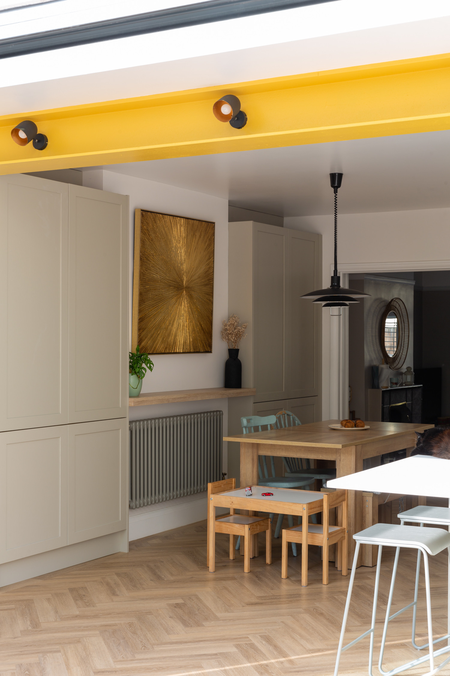 Kitchen, Kitchens By Design UK; painted in Stone. Amtico flooring, Daniel James Flooring. Steel beam painted in Babouche, Farrow & Ball.