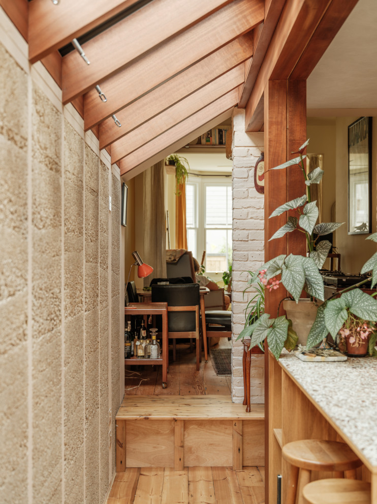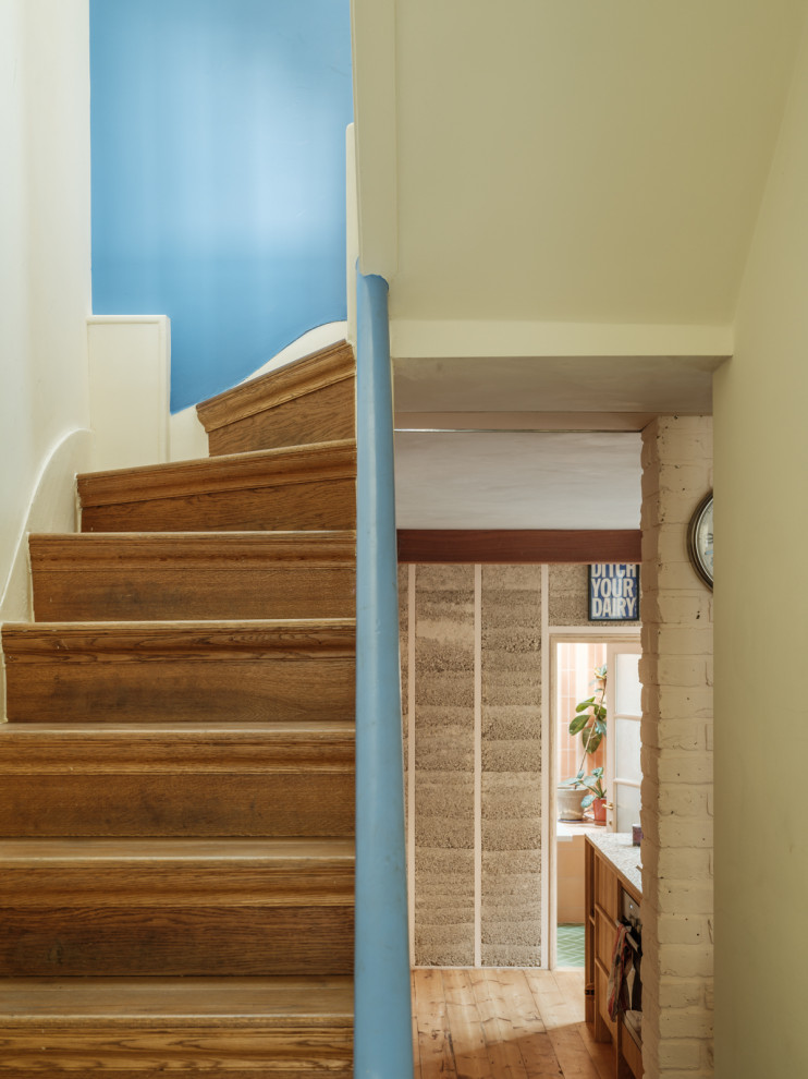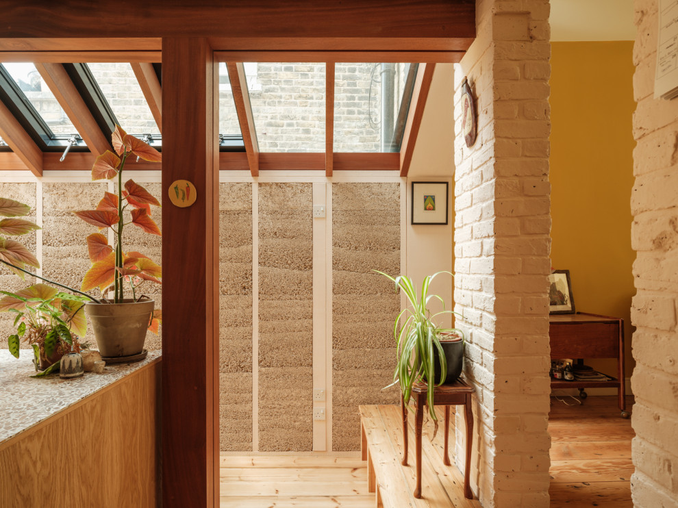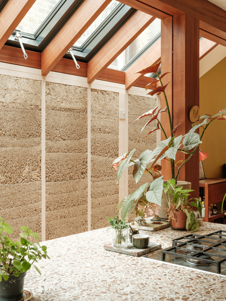 Kieran chose to keep the hempcrete exposed. “Beneath it is a plywood backer then a cavity then bricks,” he says. “Hempcrete is insulating and it regulates the humidity in the space, as it’s breathable. It’s nice acoustically, too. And leaving it exposed gives you this lovely, stratified and textured finish.”