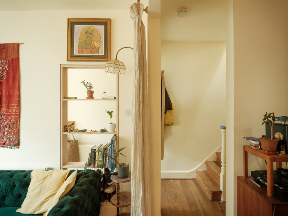 Another clever change Kieran made was to remove the original door into the front room from the hallway. He filled the void with open shelving, accessible from both sides. The bottom shelf holds shoes and the others are for decorative objects.