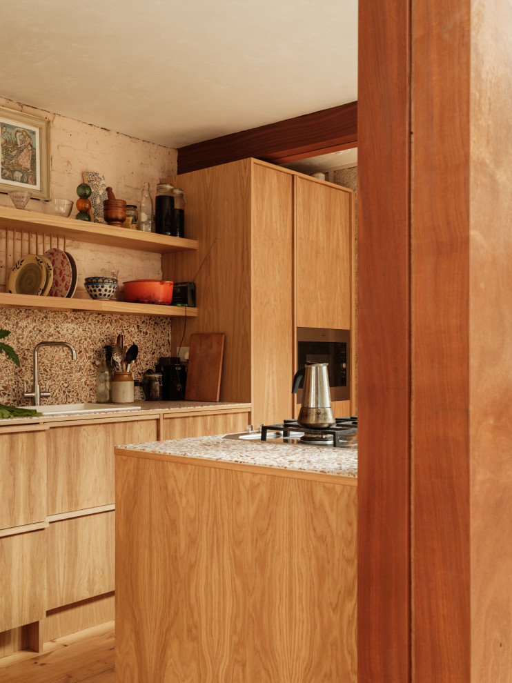 The worktop and previously seen splashback is a terrazzo-style material made from waste woodchips set in resin. “It’s all recycled and very sustainable, a lovely product. It looks like nougat,” Kieran says.