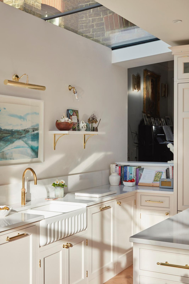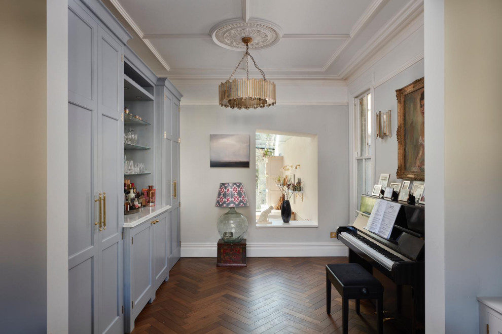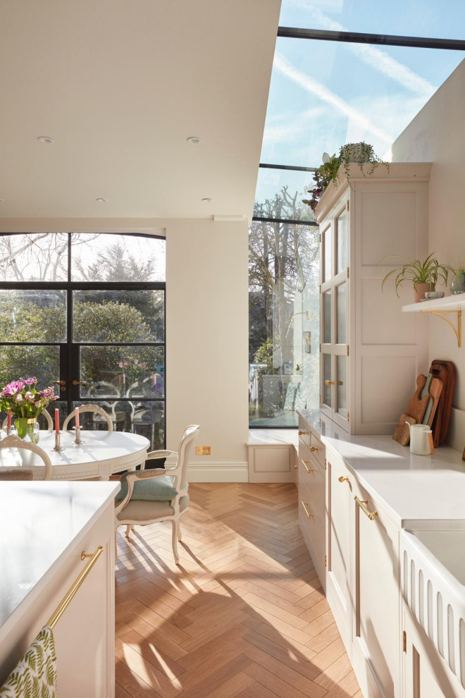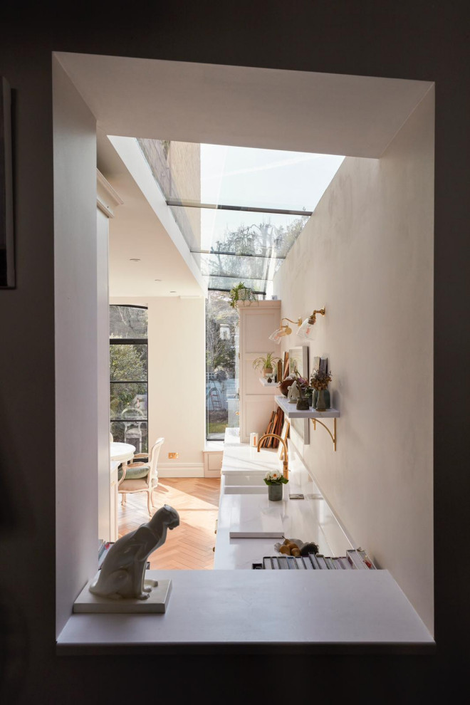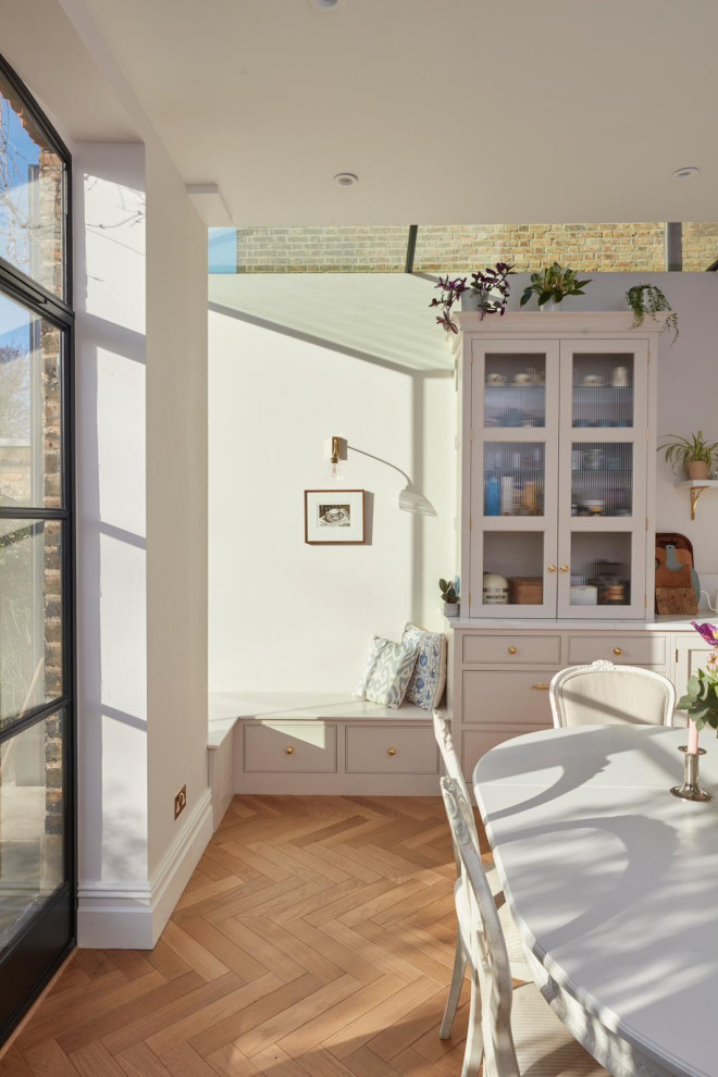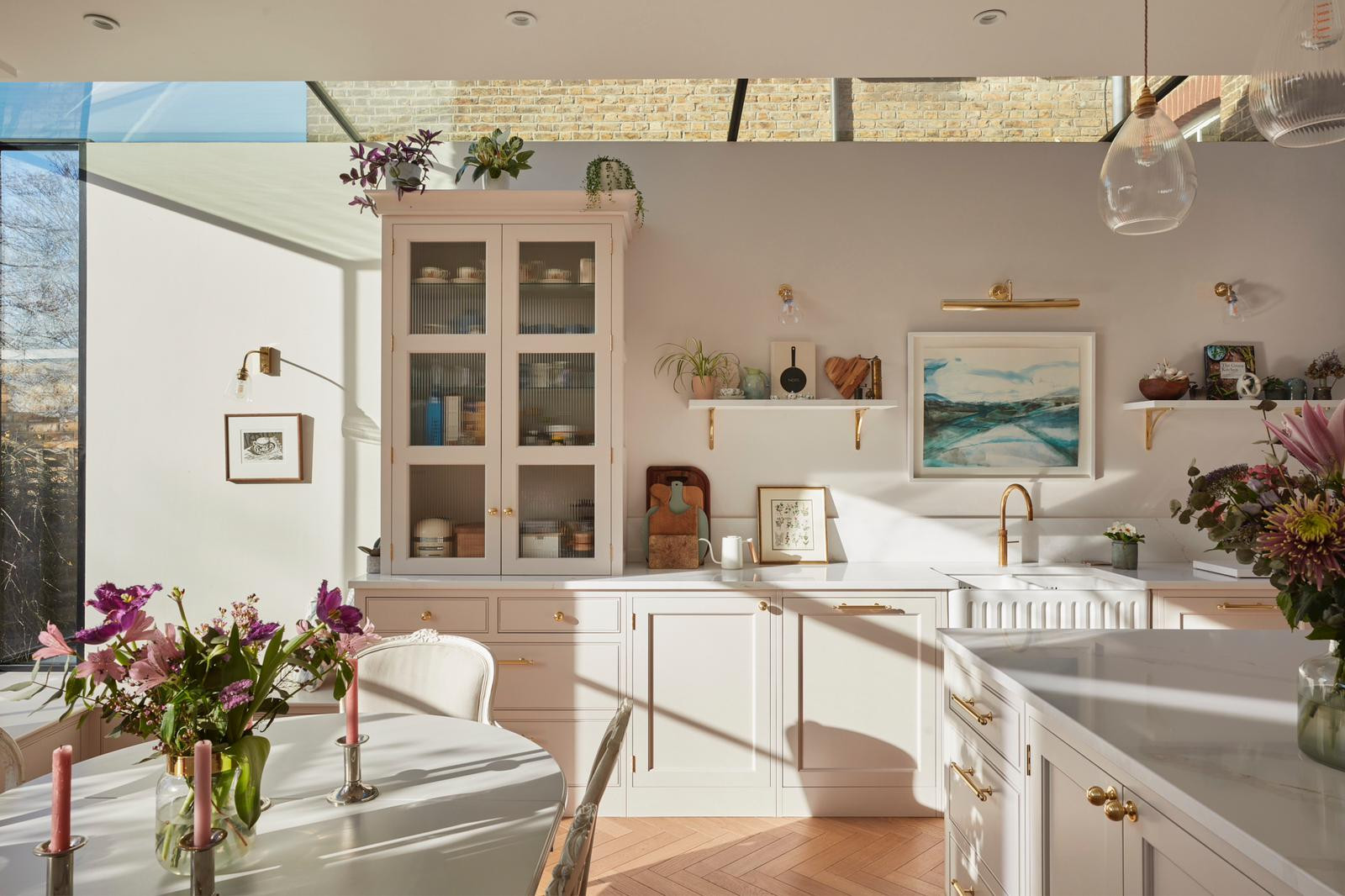 The flooring is oak parquet. “In the main part of the ground floor, it’s parquet with a dark stain,” Corrie says. “Here, it’s laid in the same herringbone pattern, but in a softer tone, so it doesn’t look too heavy in this pale scheme.”