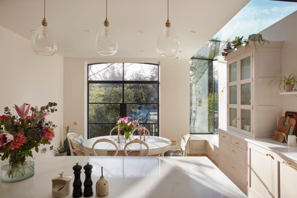 Elegant cabinets and mellow tones are paired with a striking slice of glass in this clever kitchen extension
