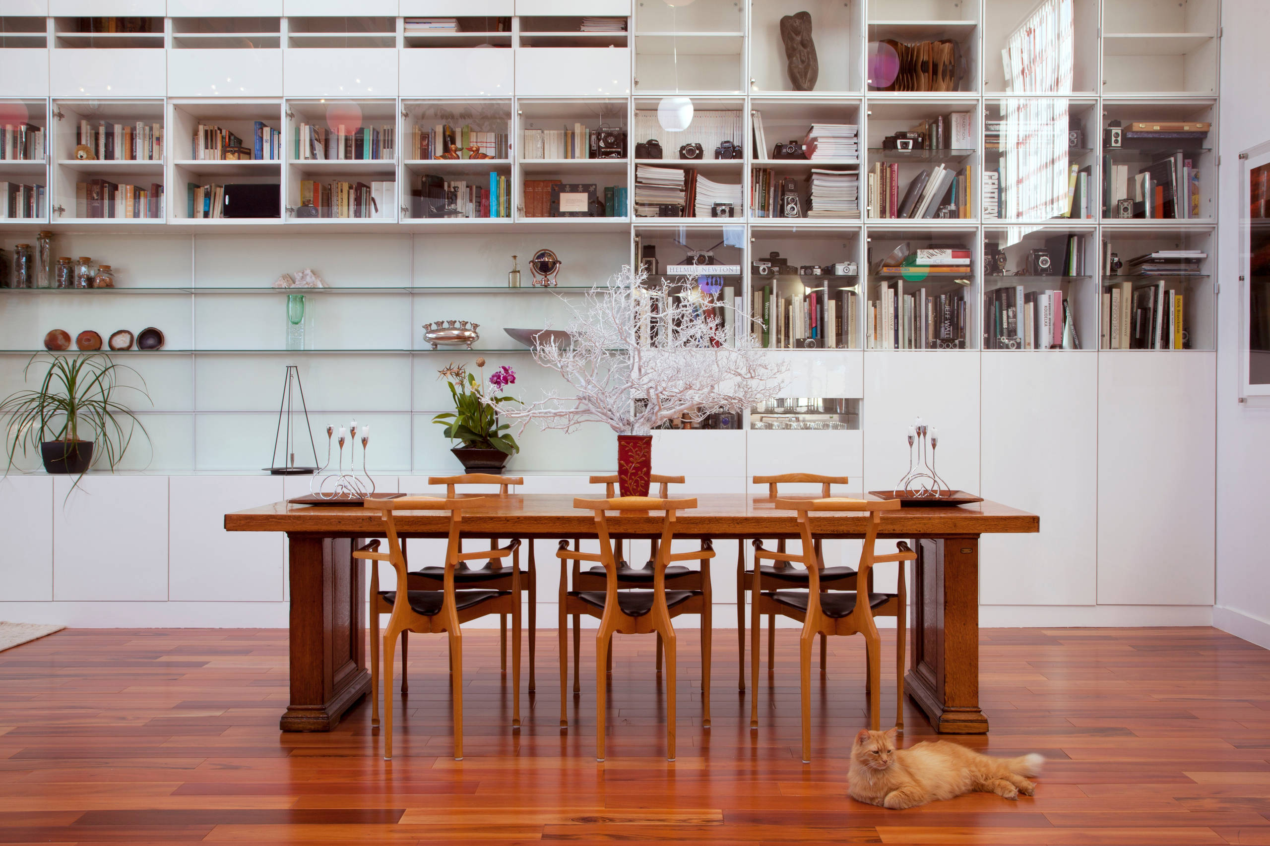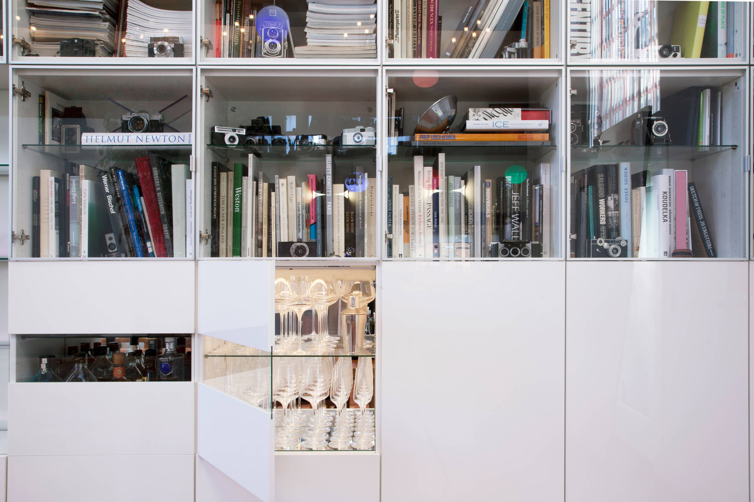 The wall-to-wall bookshelves hold Sertorio’s collection of vintage cameras. Each part of the unit is a separate component, so the pieces can be mixed and matched.