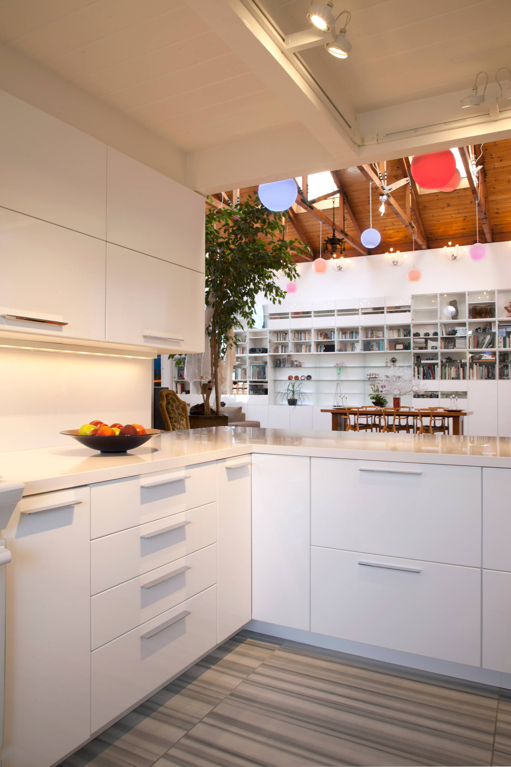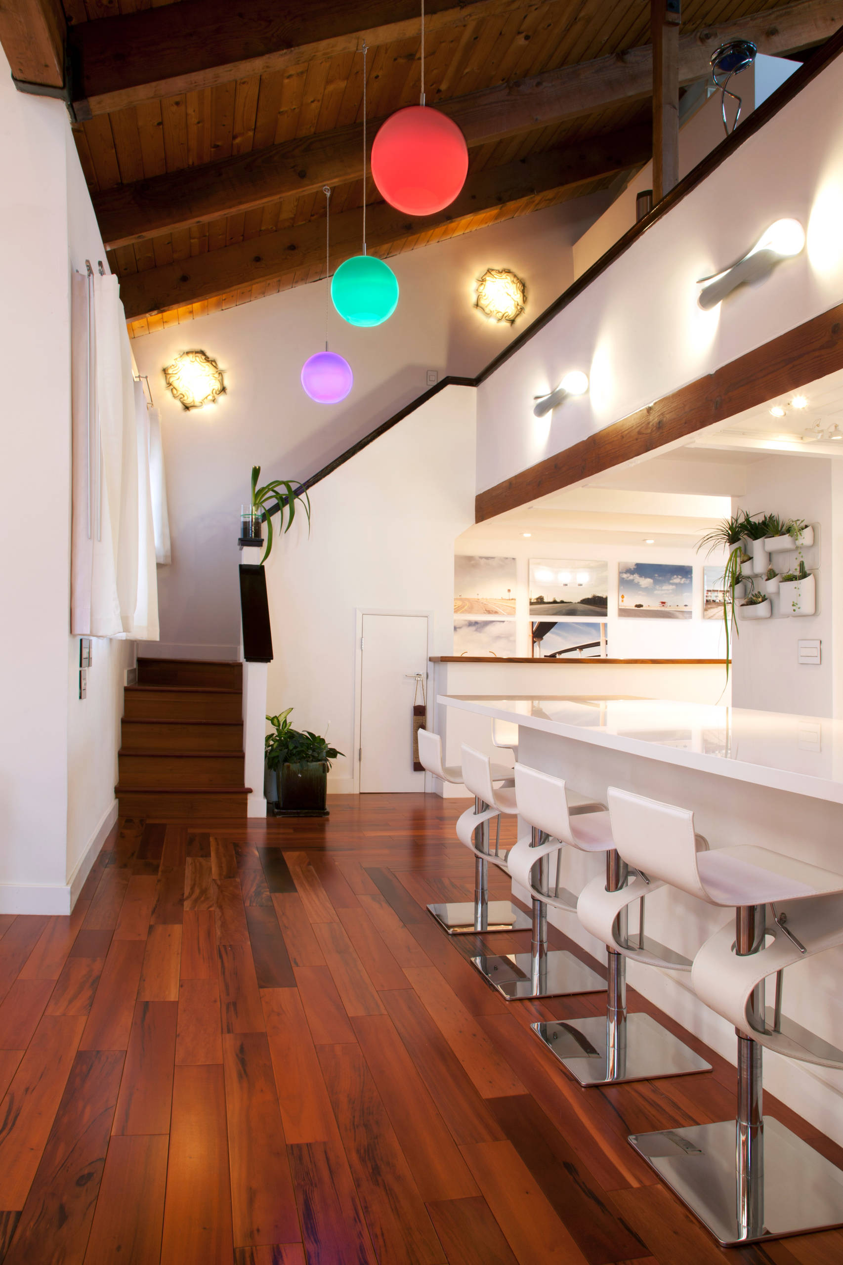 The couple maintained the mezzanine as an office and tucked the kitchen below. The hanging lights throughout the main floor contain colour-changing LED bulbs that are operated by remote control.