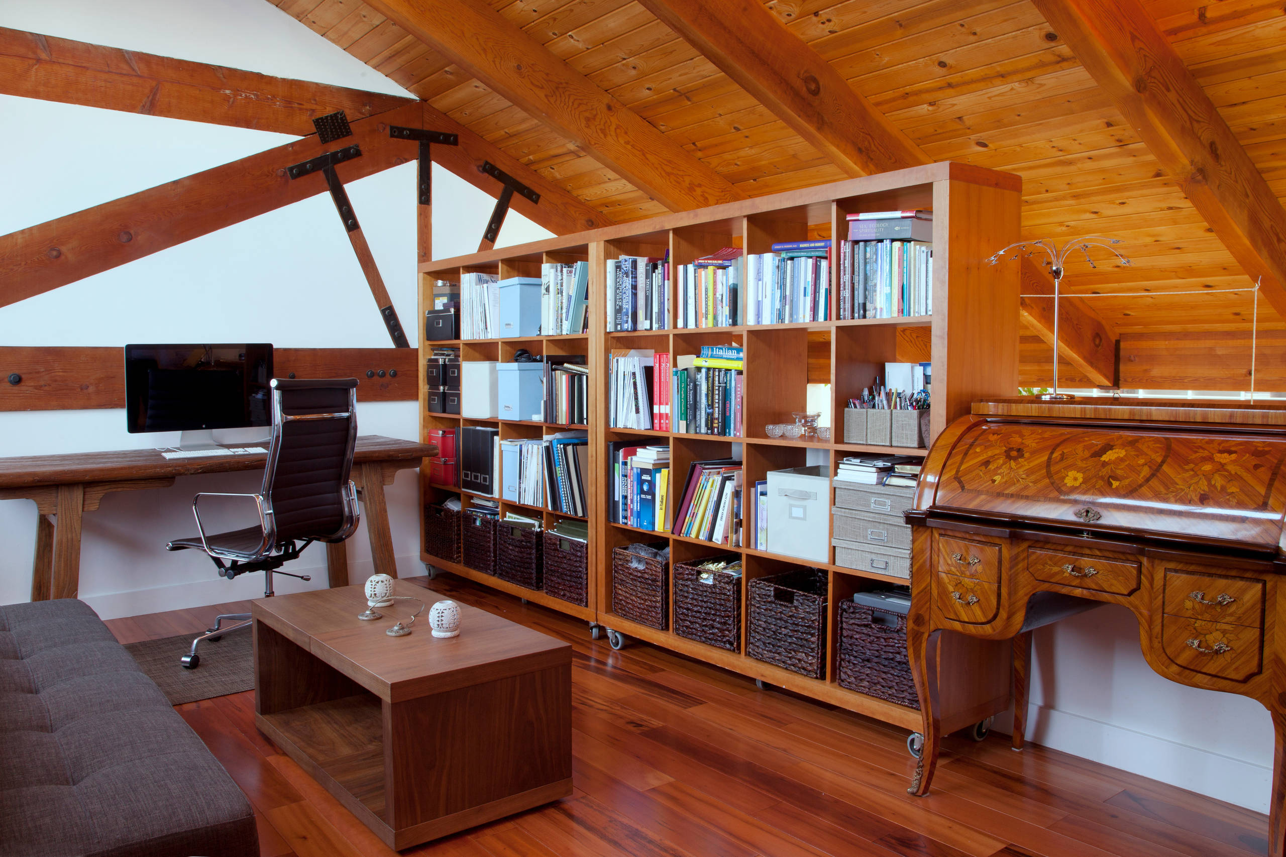 Lee uses the mezzanine for her home office. The desk, a modern version of a 16th-century French writing desk, was bought at an antiques store as a birthday gift from Sertorio.