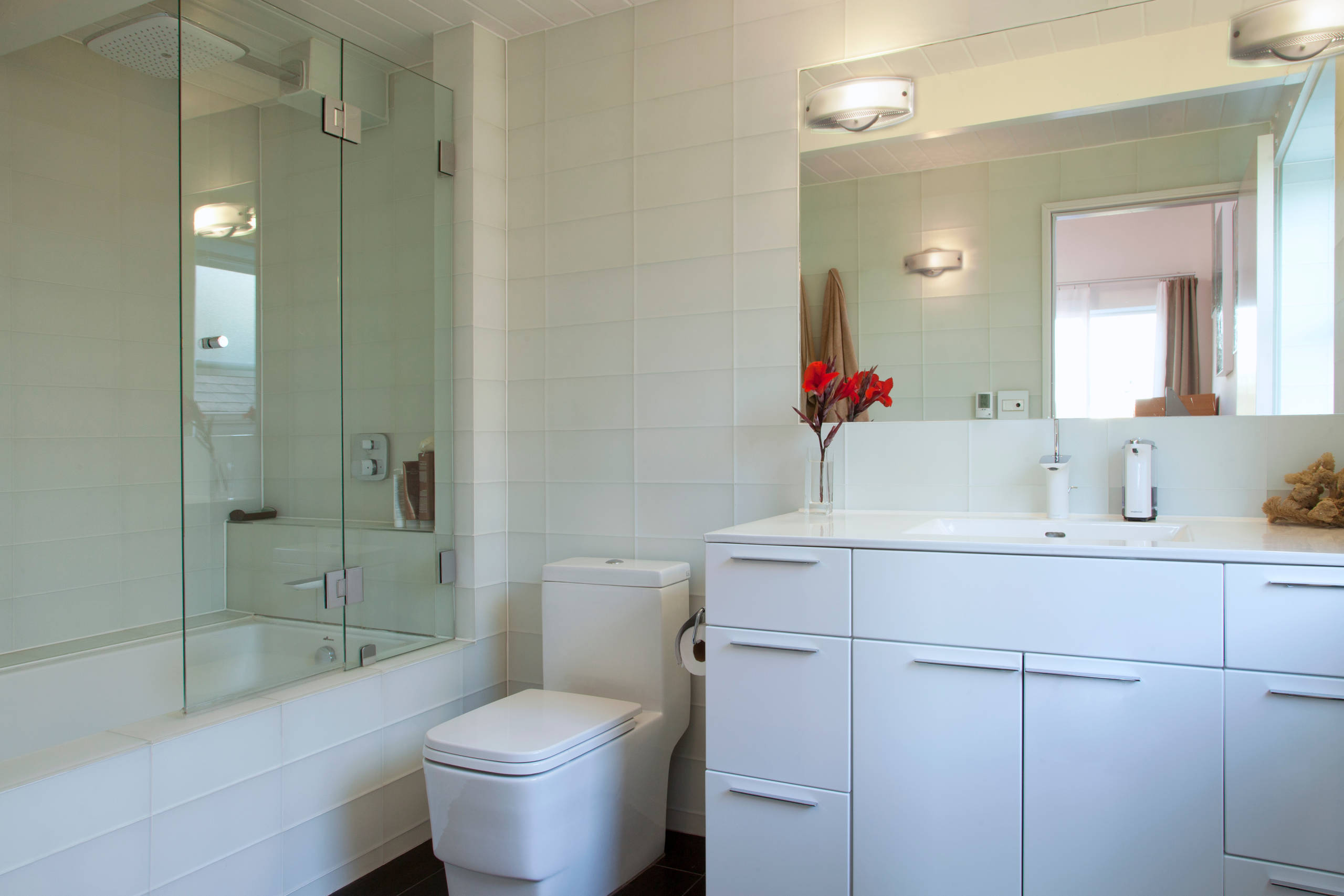 Tiles: Ann Sacks; sink, countertop: Ronbow; faucets: Hansgrohe; toilet: Blu Bathworks; light fixtures: Tiella