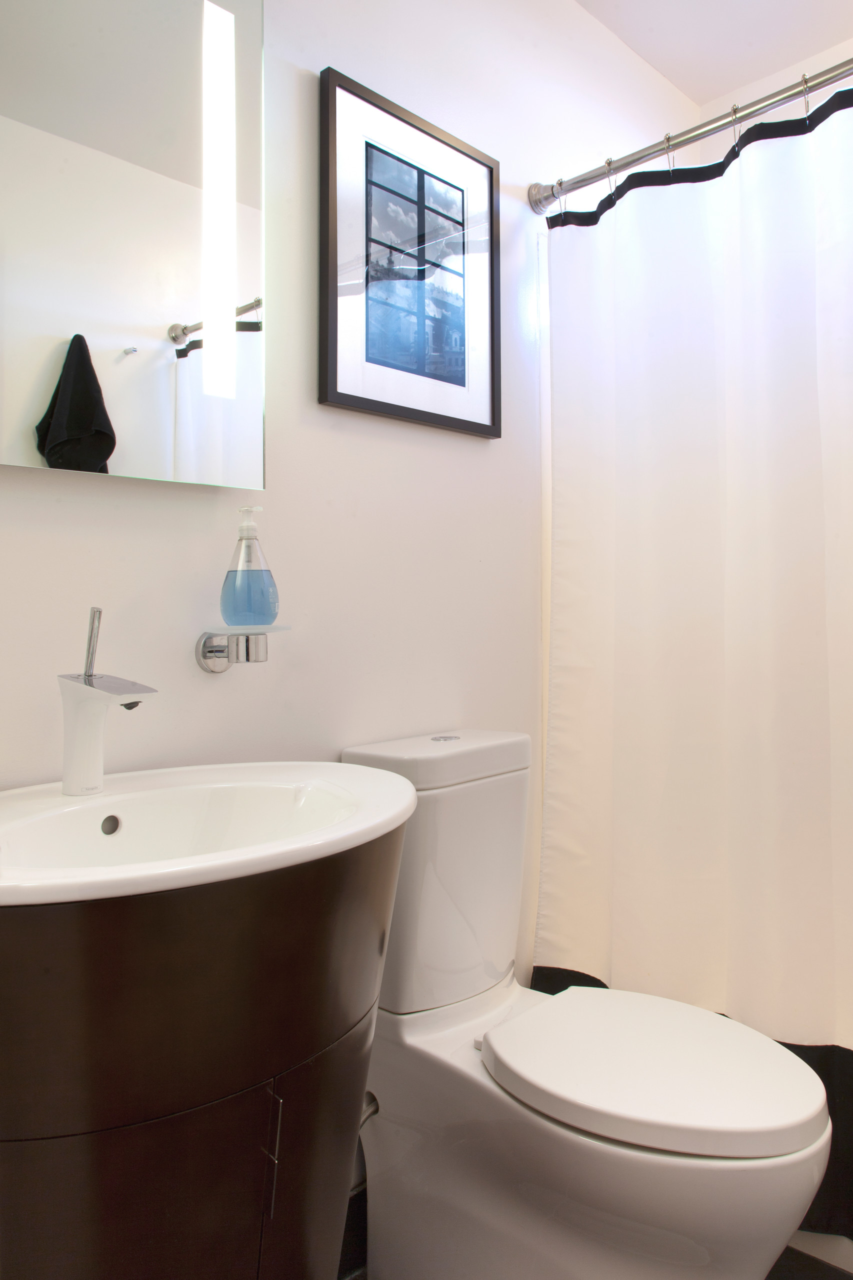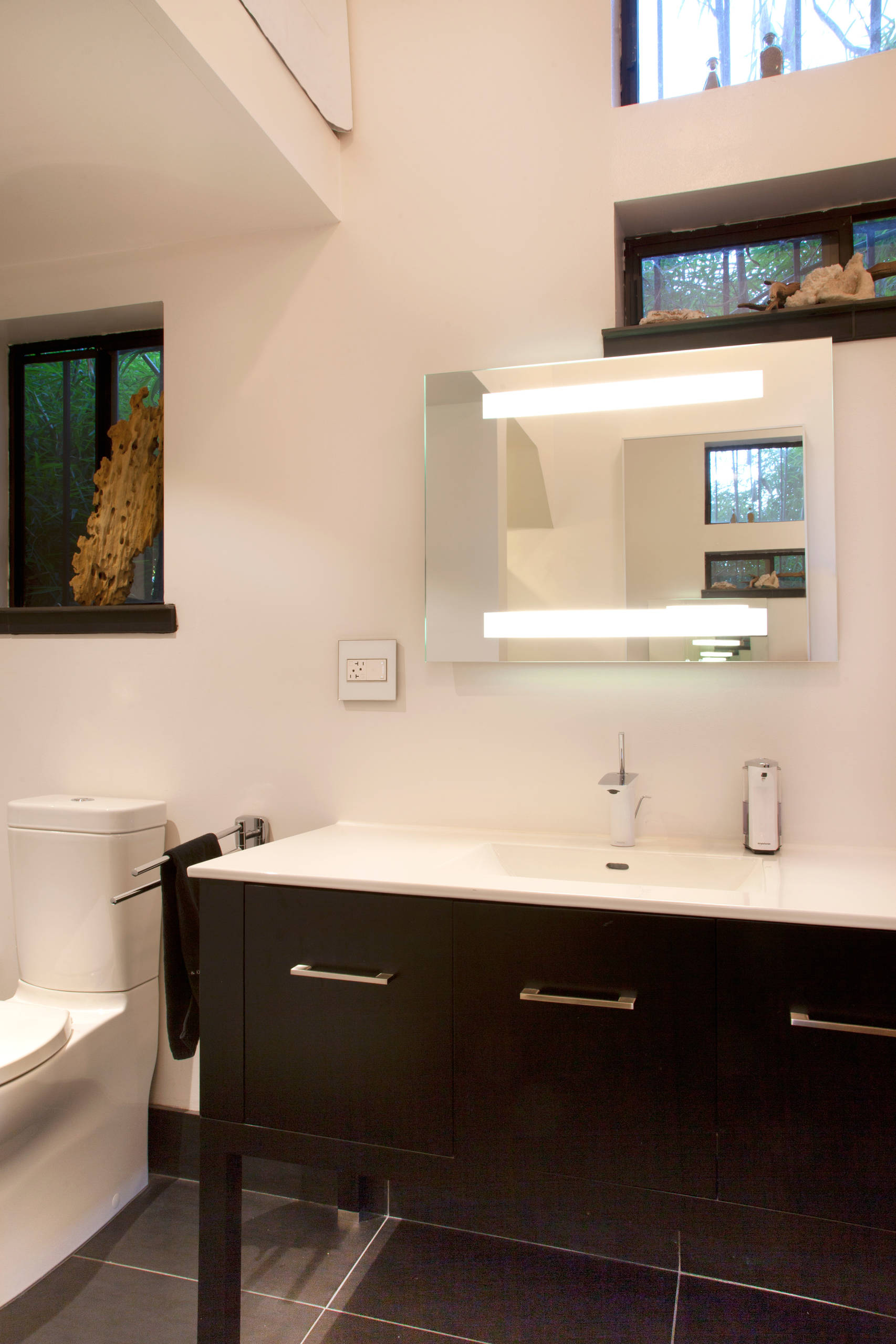 Sink, countertop: Ronbow; faucets: Hansgrohe; toilet: Blu Bathworks; illuminated mirror: Reflection Mirror, Tiella