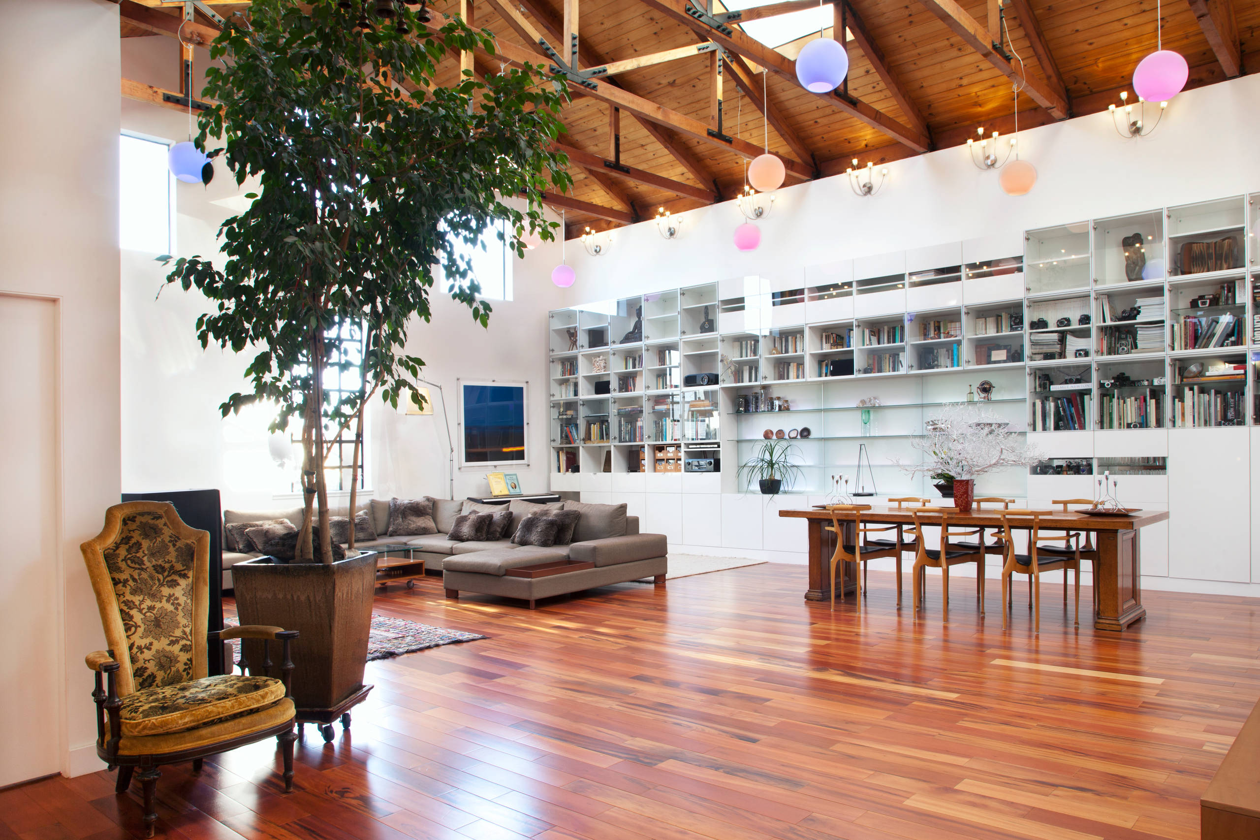Sertorio refinished an old library table bought at an auction at the Oakland Museum of California; it now serves as their dining area. The chairs are from the Vitra Design Museum.