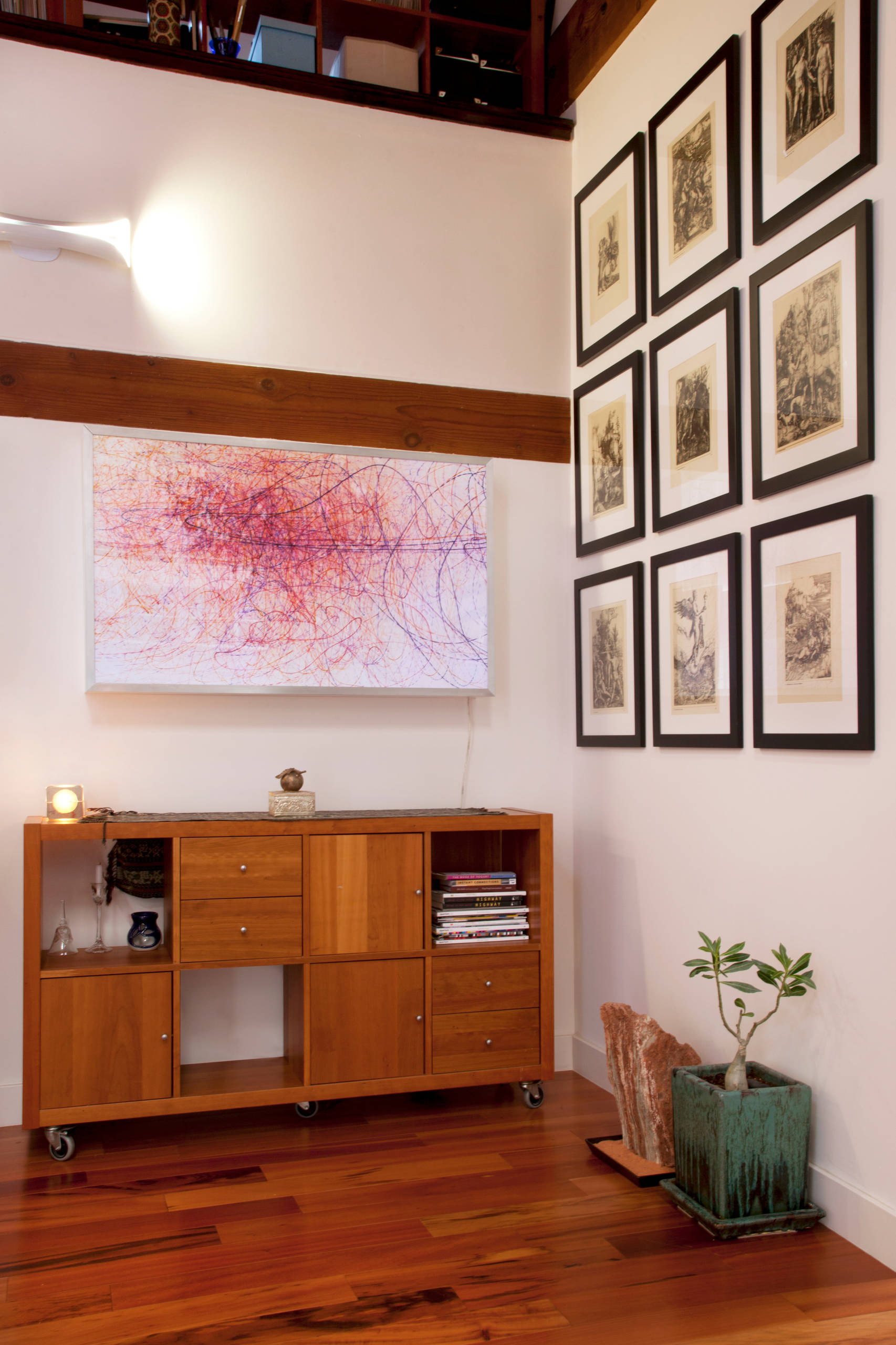 One wall holds a light panel handmade by Sertorio. Framed German lithographs hang on the opposite wall. The bookshelf is a flea market find.