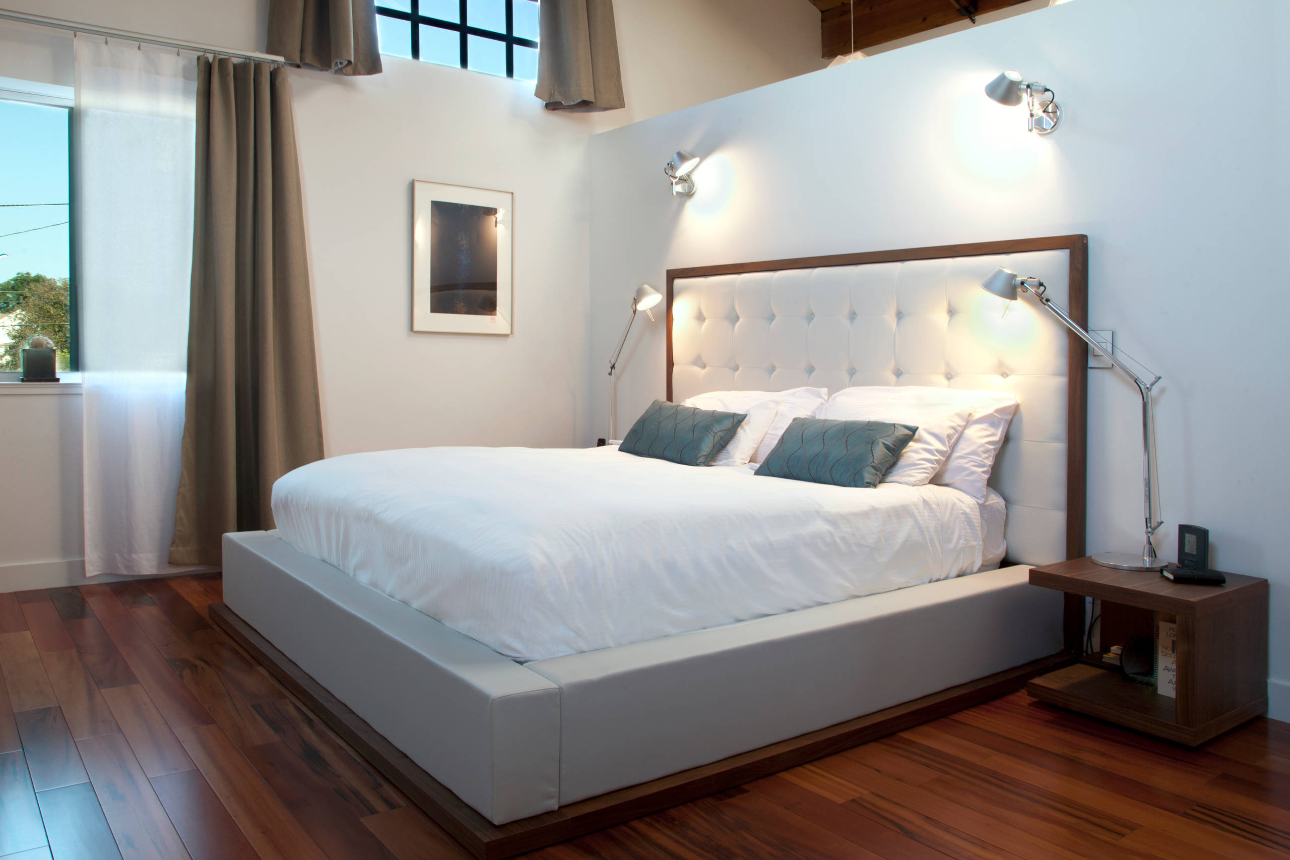 Wall lights: Tolomeo Classic/Micro Wall Spot, Artemide; bed, headboard, side tables: Modloft; walls: Roxul