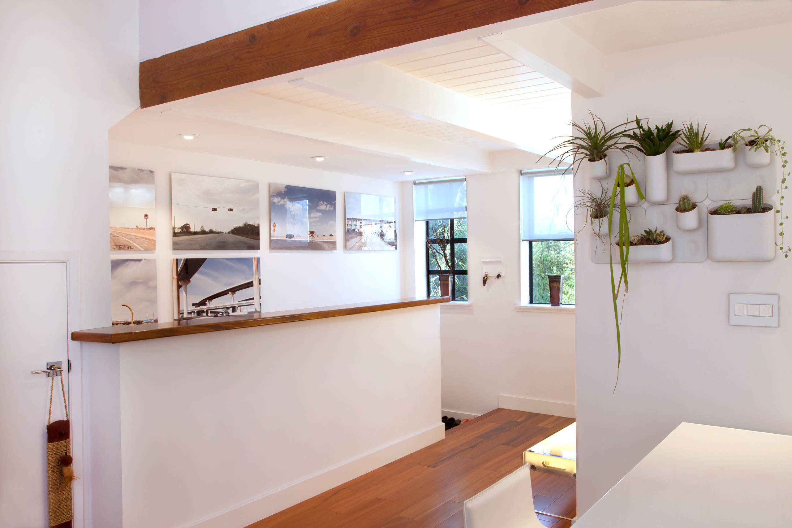 The entrance is lined with Sertorio’s photographs, part of his ‘Passages’ series, taken on road trips around the country. The vertical garden contains various succulents.