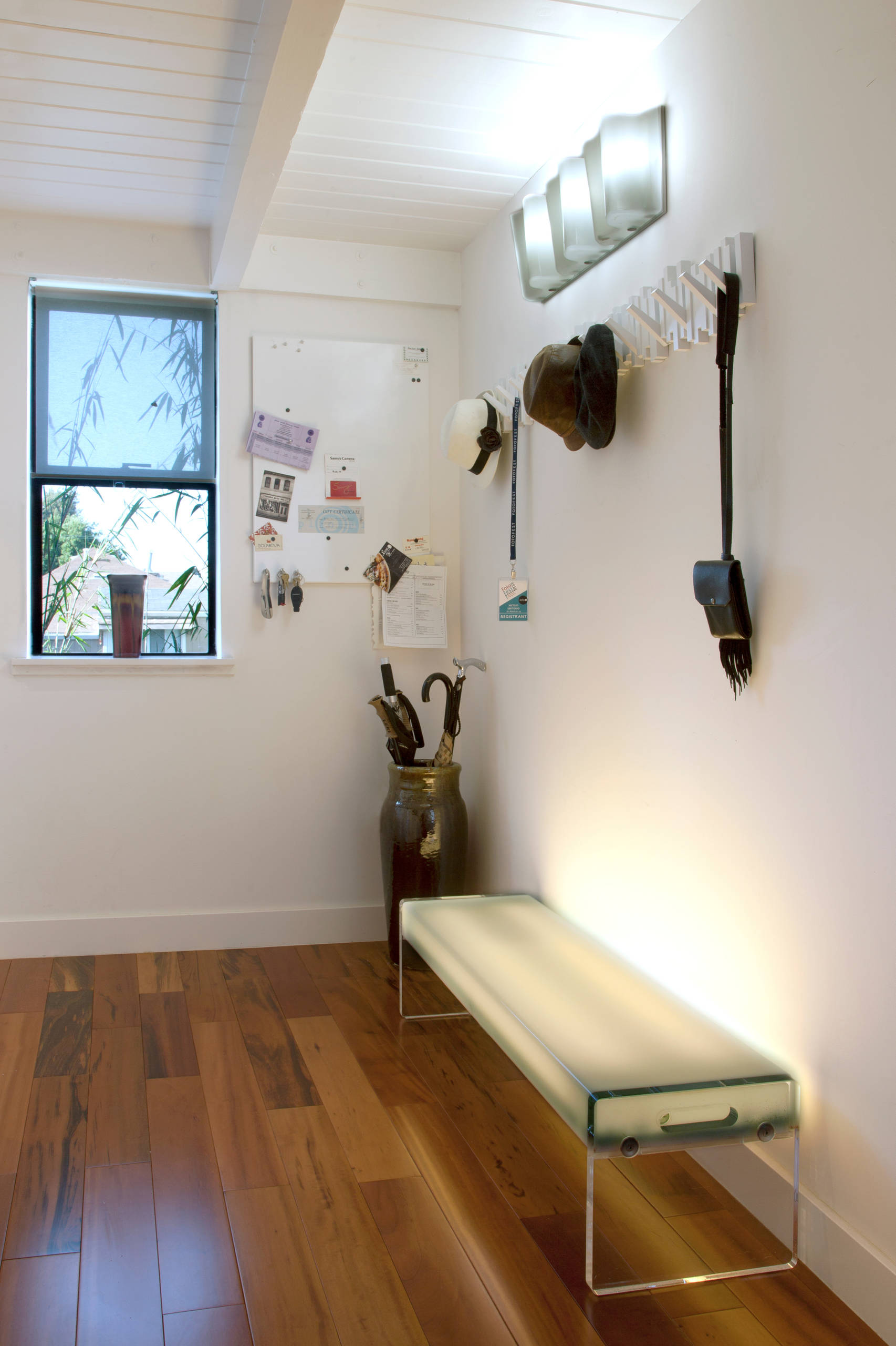 Logico Triple Wall Sconce: Artemide; Light Table Bench 52: Pablo Pardo; coatrack: Umbra