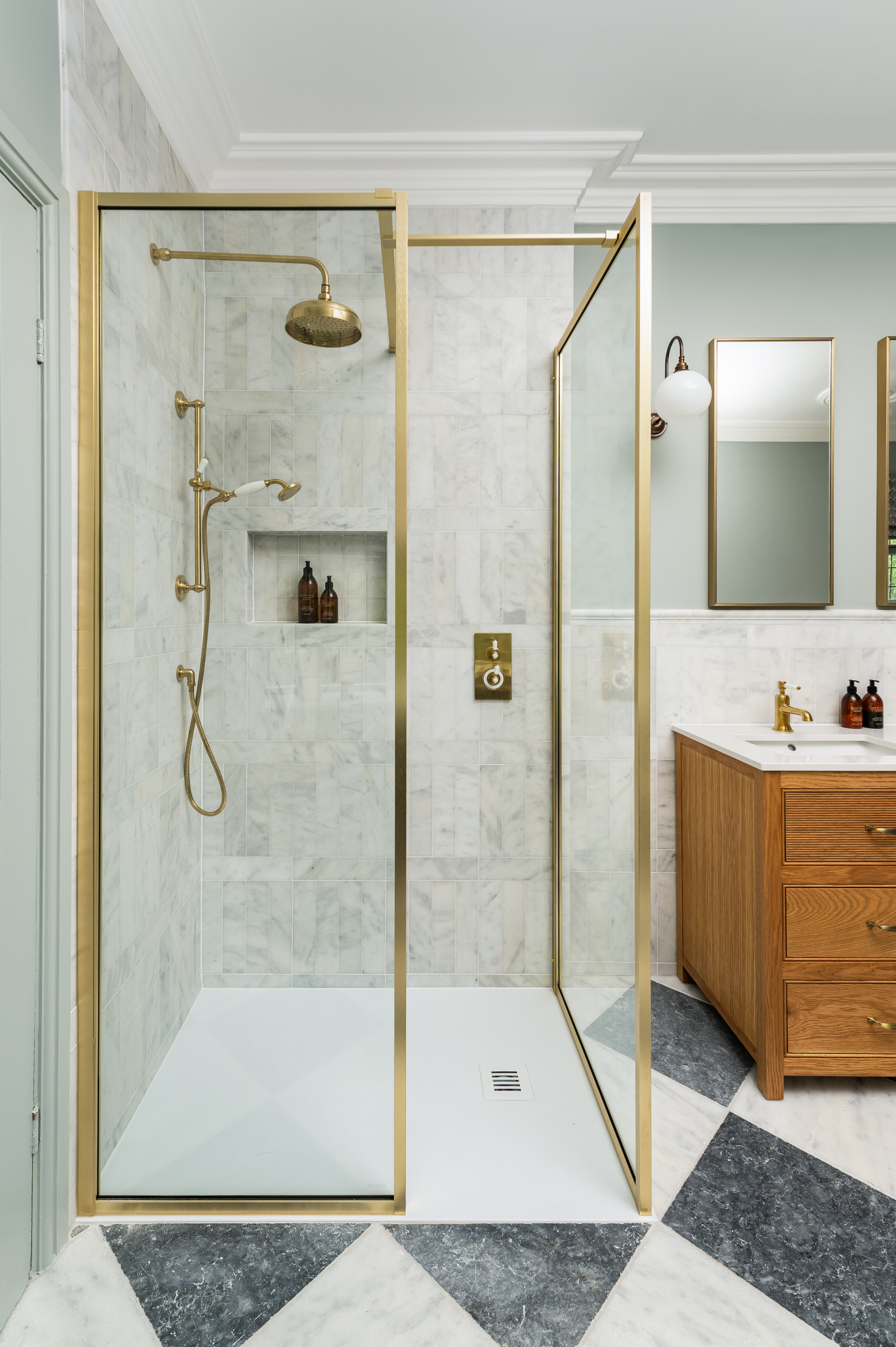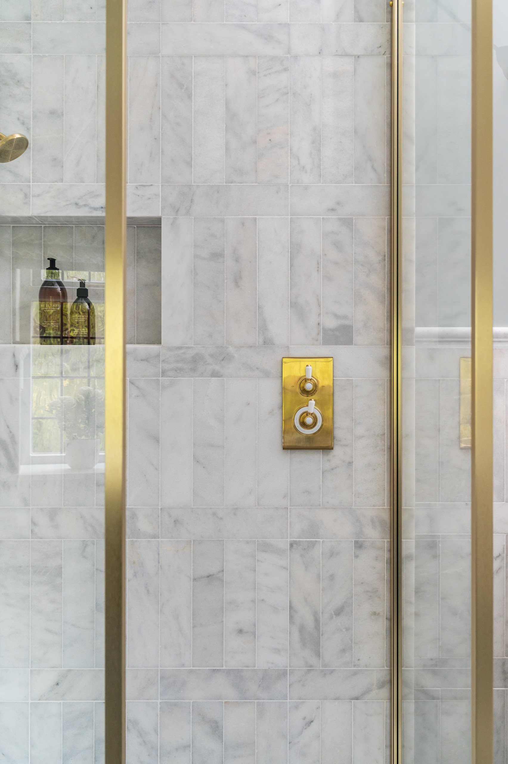 The shower also has a modern, walk-in feel. “We managed to get it flush to the floor by setting a shower tray with a very slim profile into marble tiles that have a bit of depth to them,” Elizabeth says.