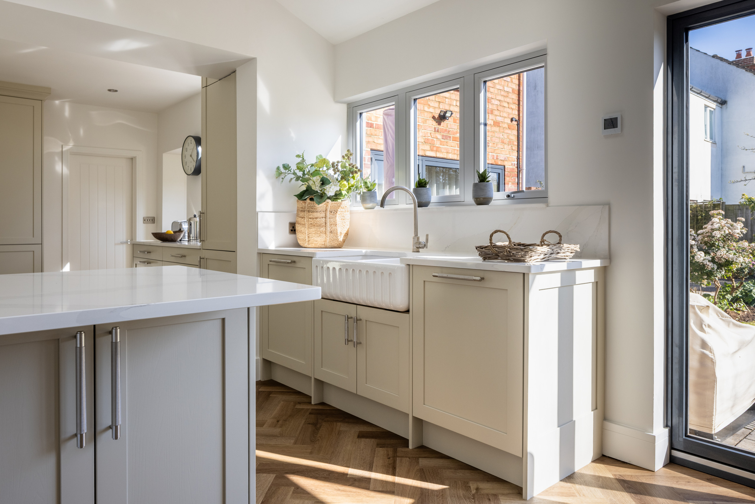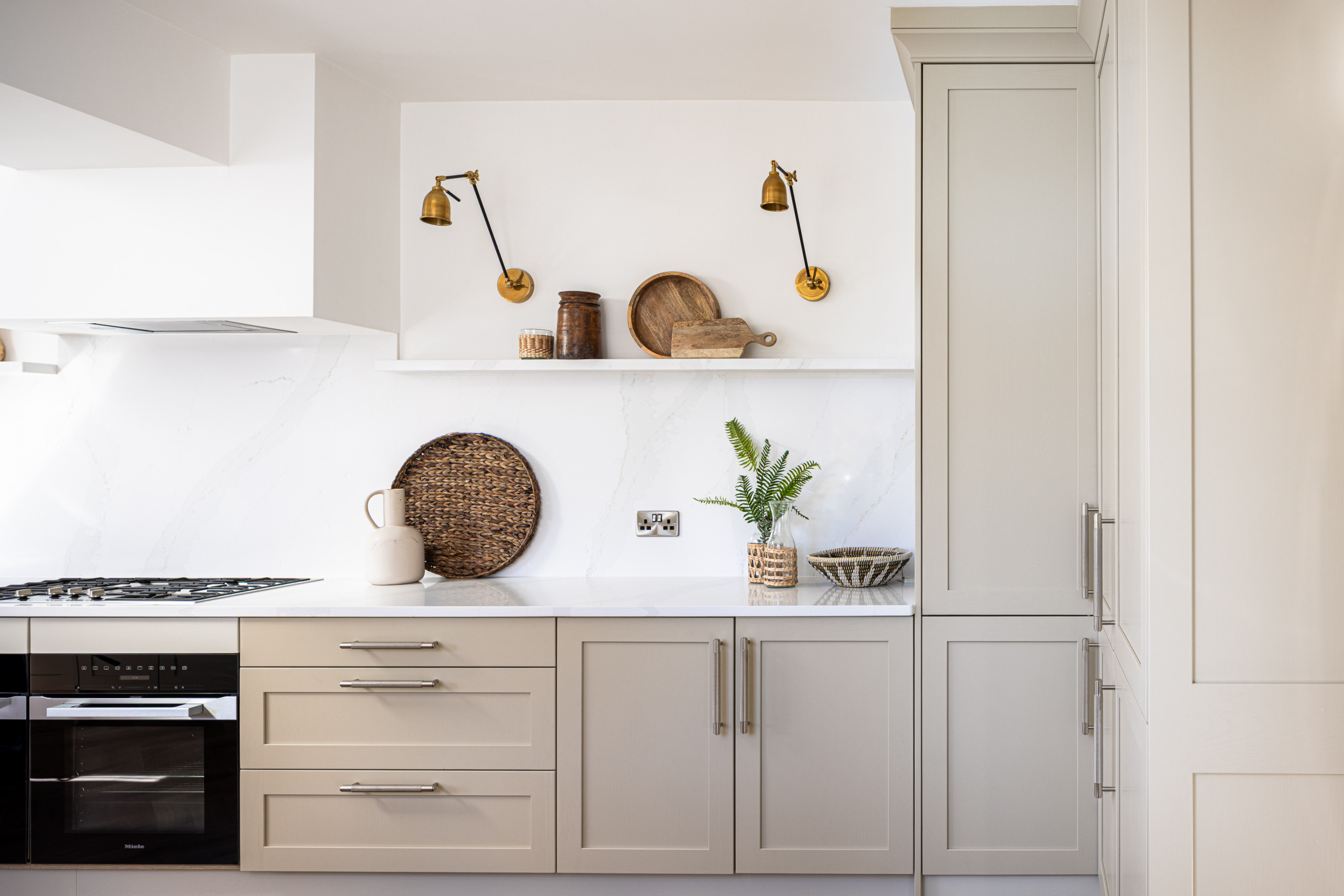 Shaker-style cabinets bring the fresh, up-to-date look the owners were after. “They’re timeless, too,” Andrea says. “I’m always trying to make sure the design works long-term as well as feeling contemporary. In the future, if the owners tire of that colour, they could very easily have them repainted, rather than having to do a whole new kitchen.” The cabinets were made bespoke and painted in a soft putty shade.