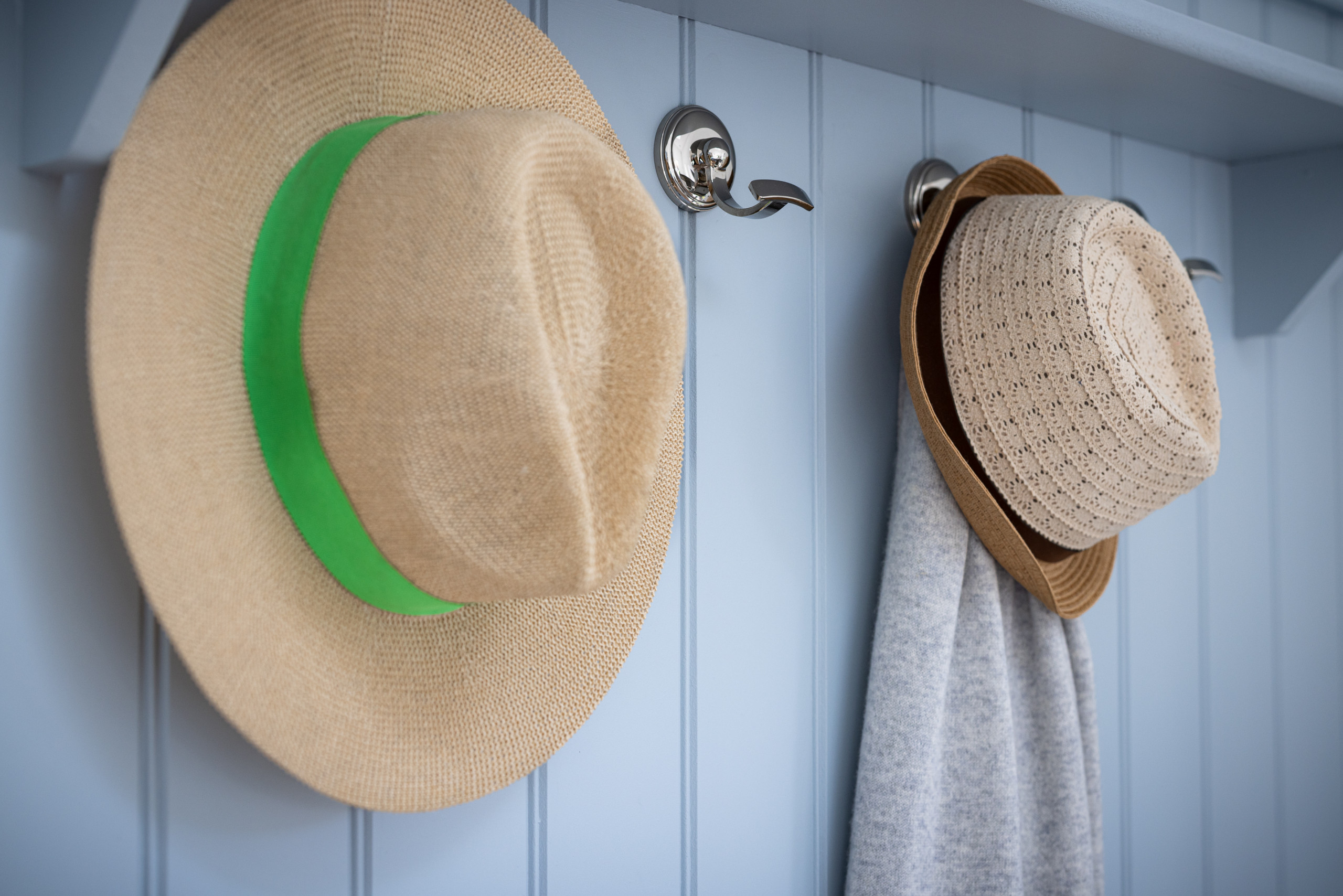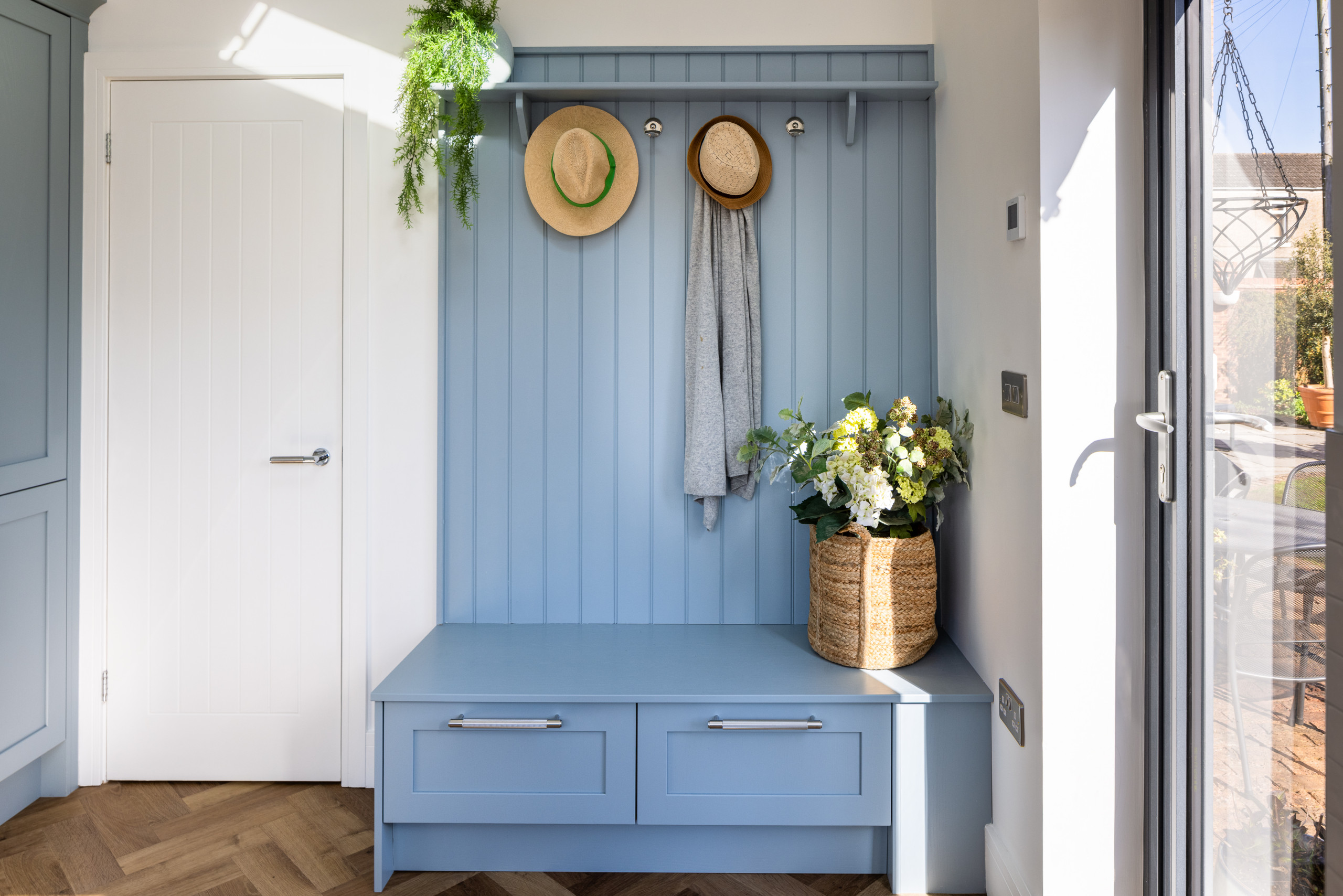 Between the kitchen door and the back door there’s a built-in coat rack with seating and storage.