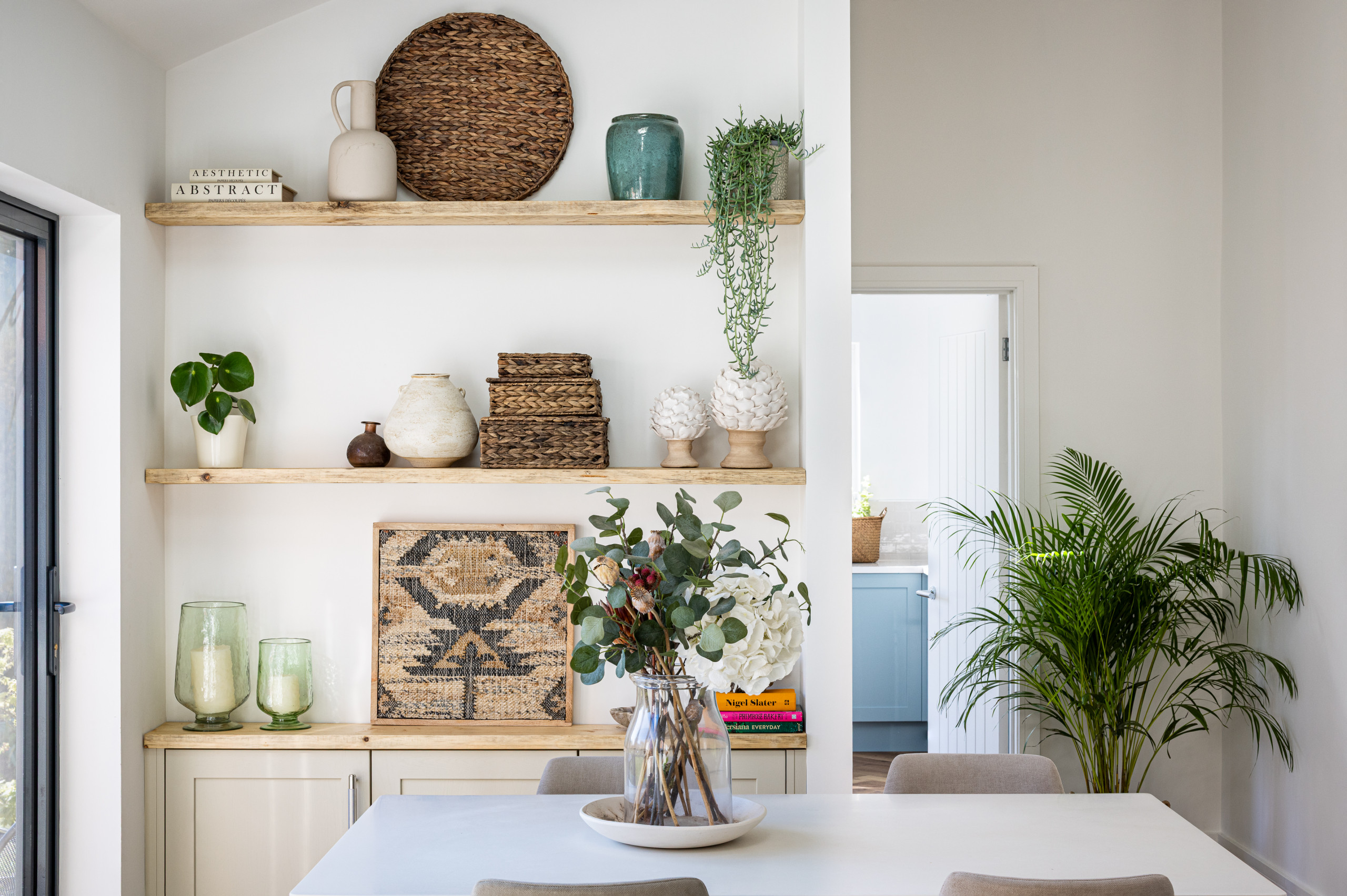 There are timber shelves in the dining area, which tie in beautifully with the oak-effect floor. They’re made from old scaffold boards. “I wanted something that looked a little bit rustic and not super-neat in here,” Andrea says. More bespoke units, built to fit this shallow space, house glasses.