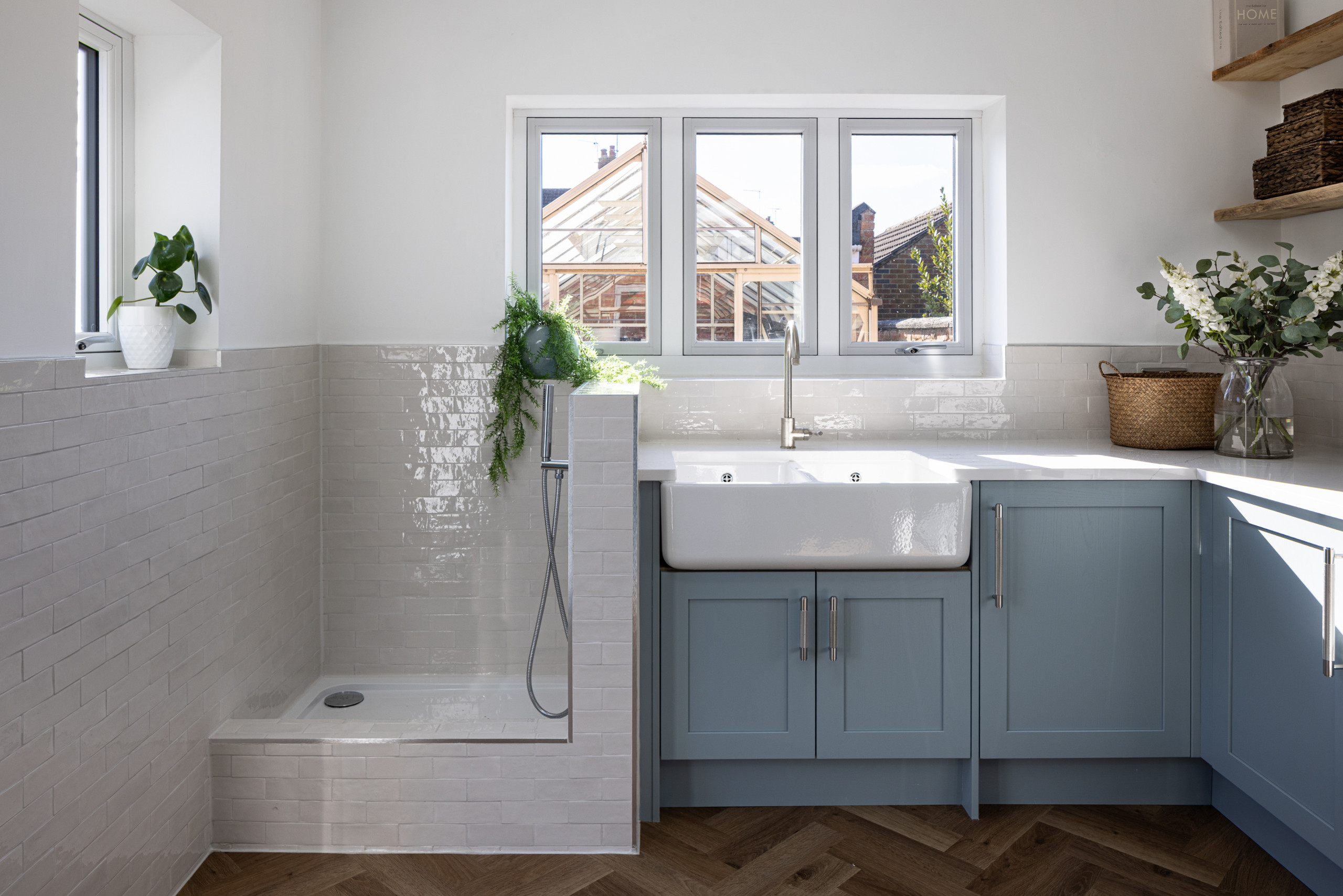 LVT in Natural Oak, Invictus. Sink, Shaws of Darwen. Cabinets painted in Bone China Blue, Little Greene. Tiles, Claybrook.
