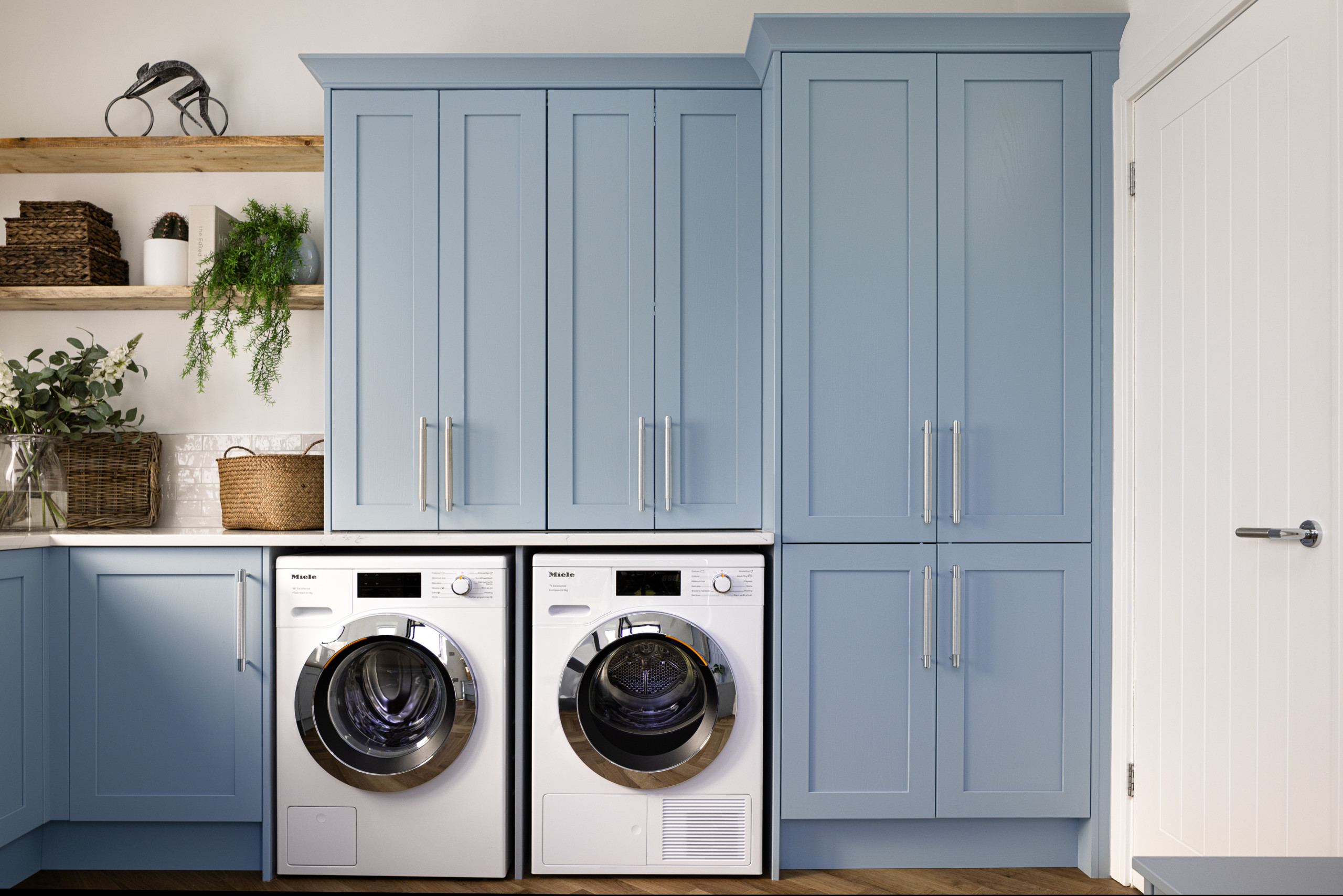 There’s ample storage for cleaning and laundry products here, as well as space for a washing machine and tumble dryer, and open shelves for display.
