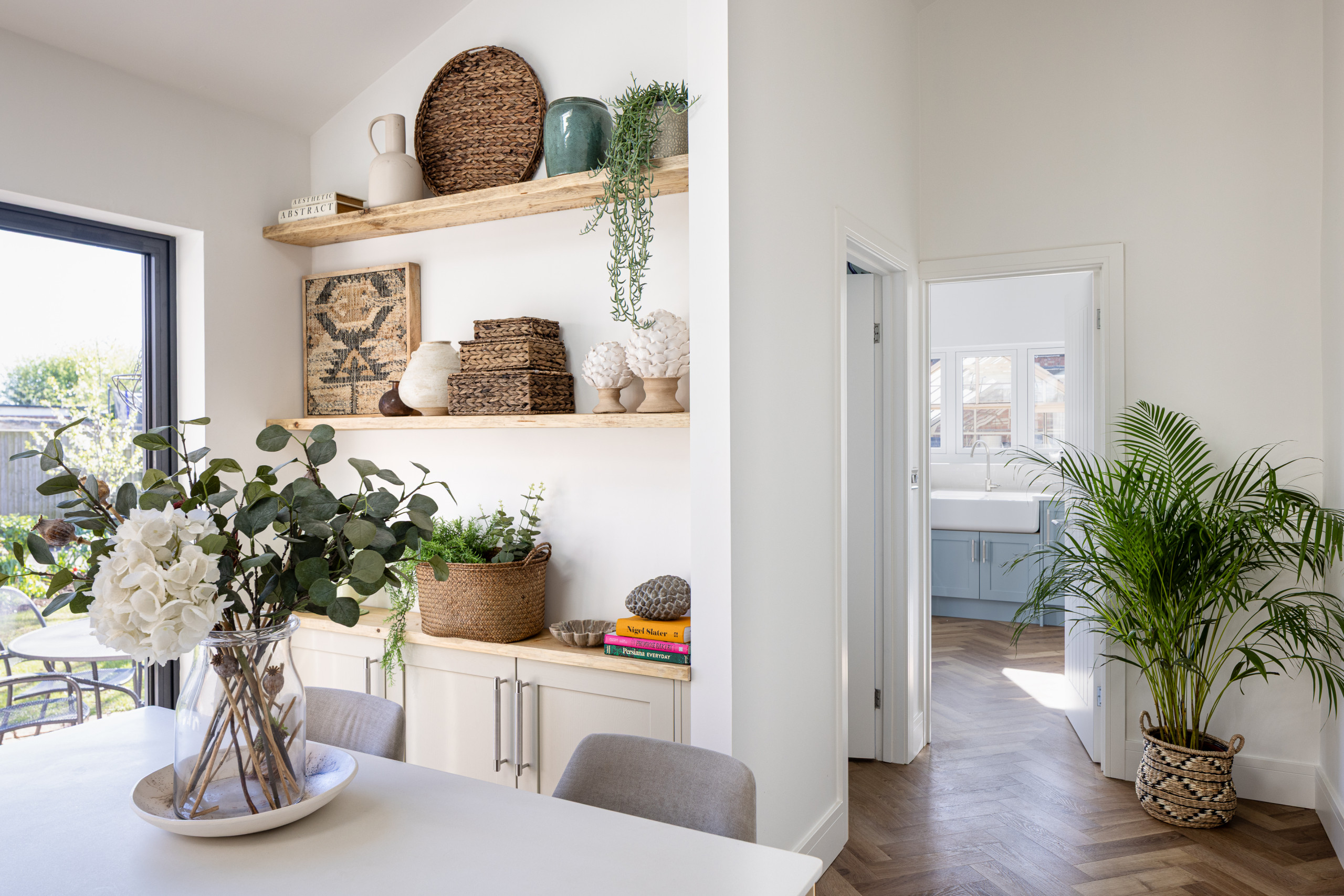 The bathroom was stripped out and a smaller cloakroom created in its place. This meant the once narrow corridor could be widened and made shorter, with space freed up for the dining area. Bifold doors give views of the garden and let in lots of light.