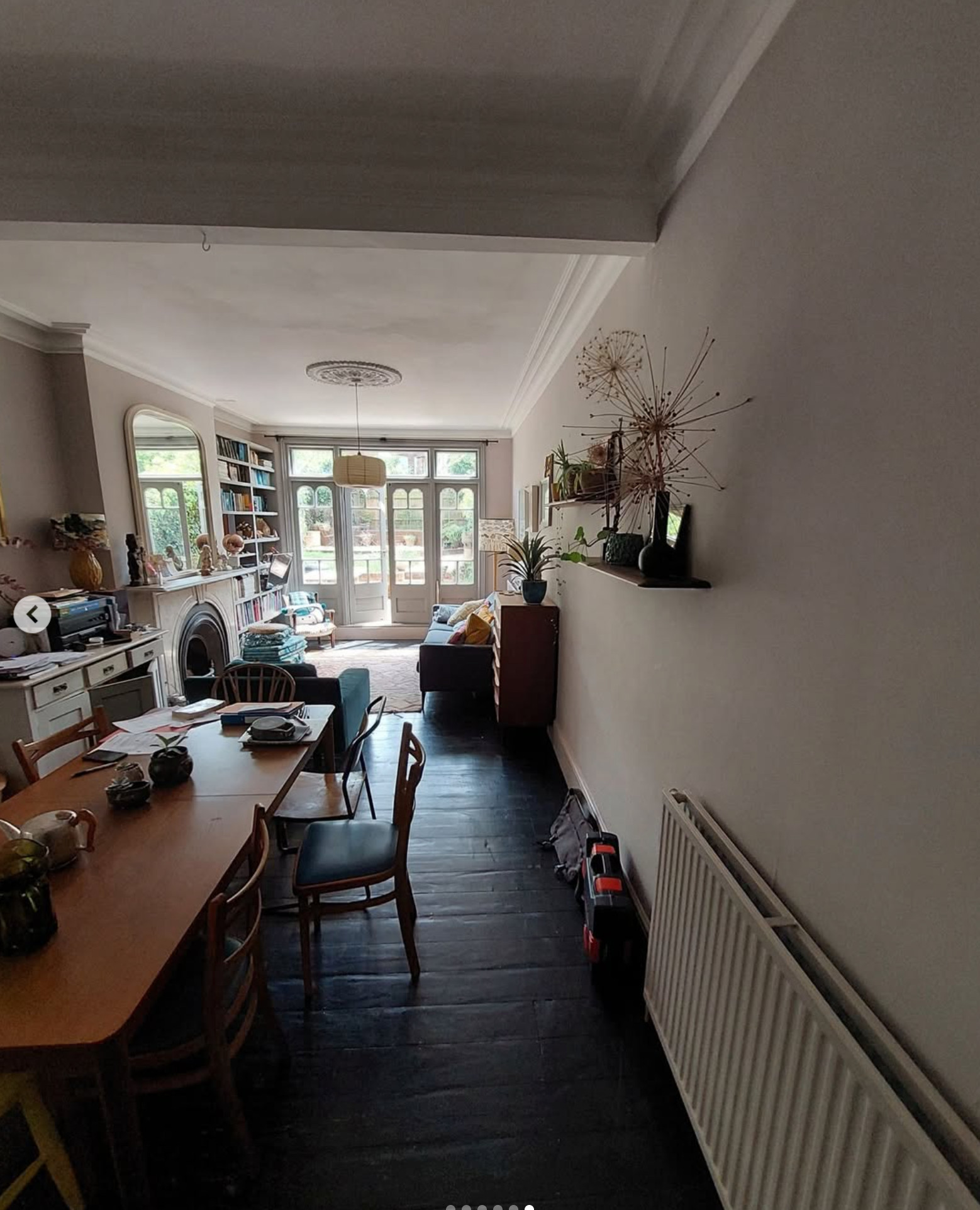 This photo shows the room before works (the old kitchen is behind the camera). The living room at the end wasn’t as cosy as it could have been and there was a shortage of storage.