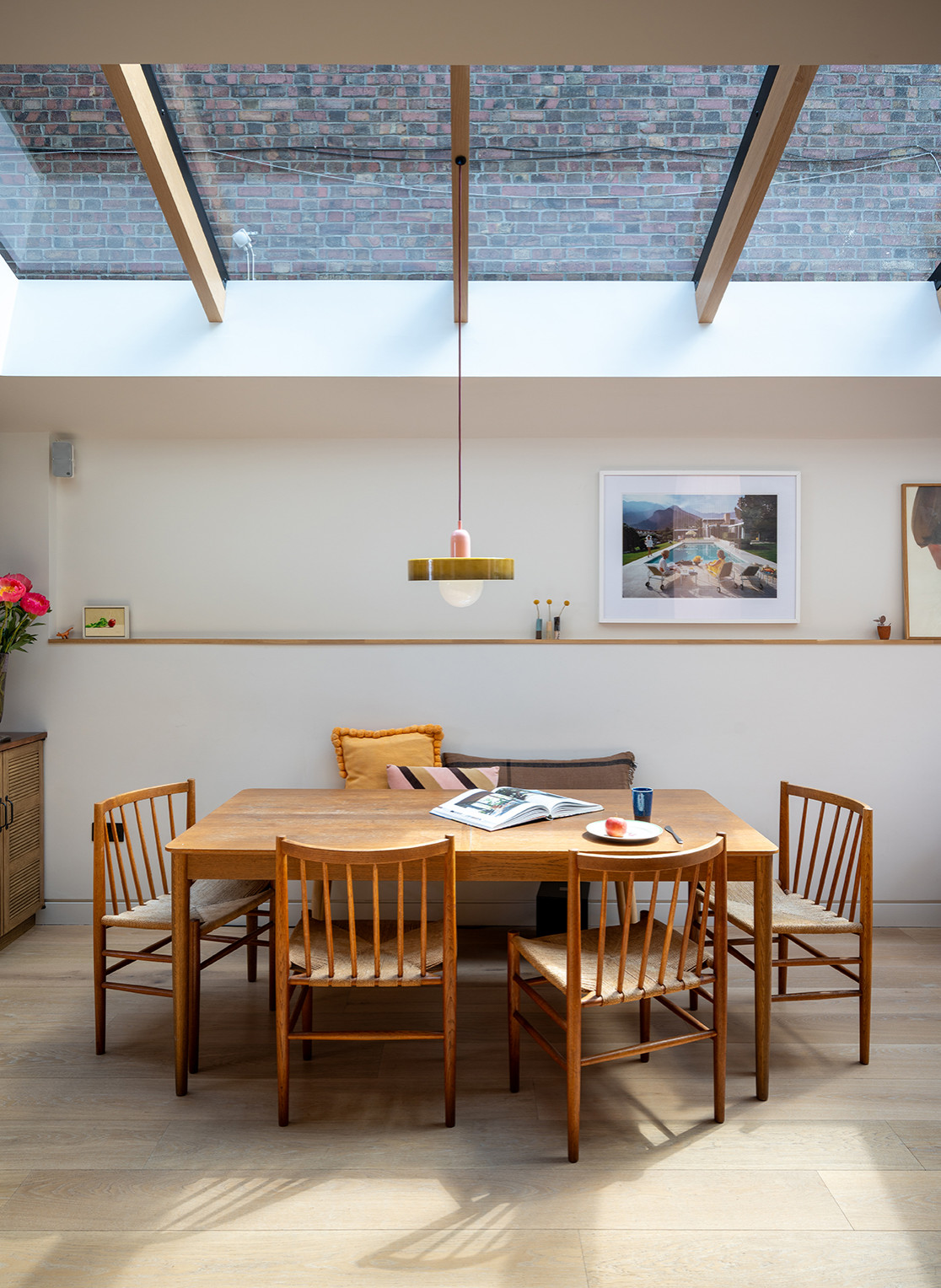 The skylight beams echo the oak flooring. “At first, we only had the metal beams, which are there to support the glass,” Johanna says. “But they looked too thin and we wanted to beef them up, so we created the oak-veneered beams below, which are only decorative and to hide the pendant light flex. They visually make the house harmonious – everything is the right scale and proportions for human comfort.”