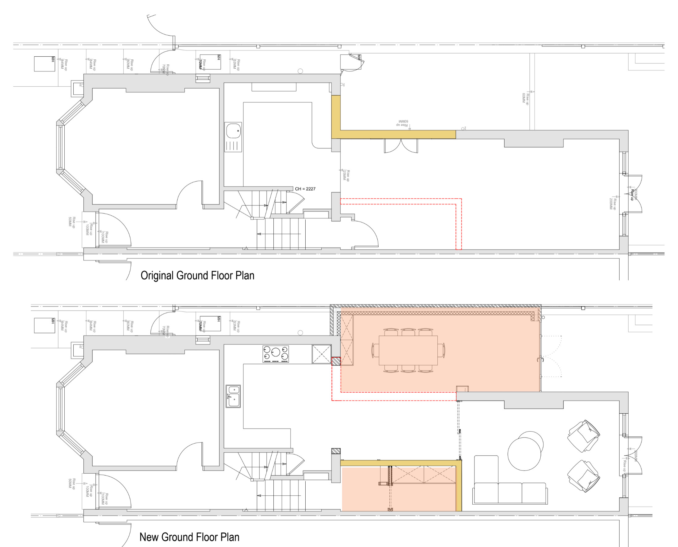While the side extension has made a huge difference, the real game-changer is the boot room, seen here at the bottom of the new plan behind the living room. “[The family] didn’t have much storage before, but now they can put their clothes and shoes and bags away while still having a beautiful space,” Johanna says.