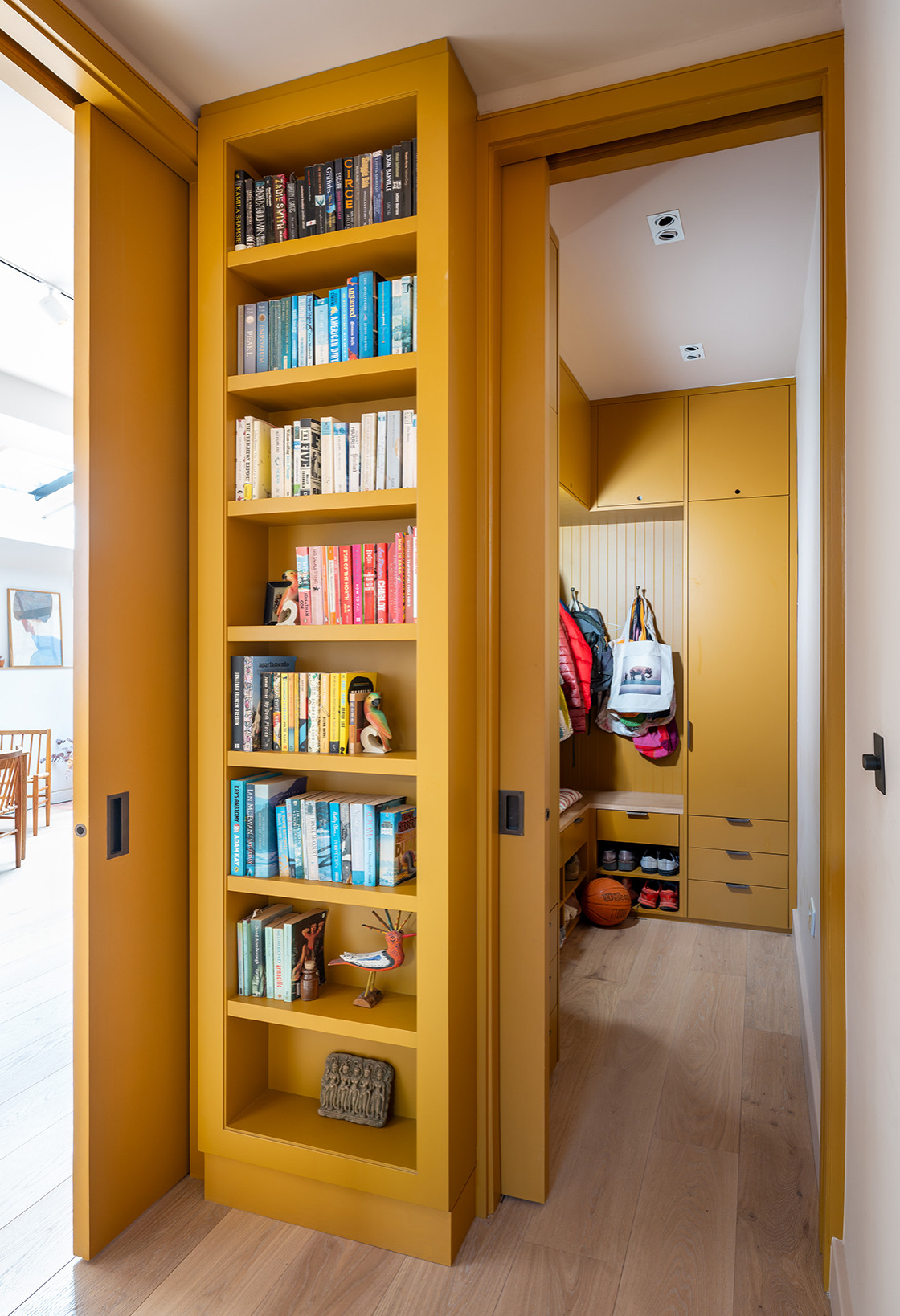 Johanna built a bookcase on the end next to the pocket door. “It’s about what you see when you come down the stairs [from the raised front of the house] – nice books and objects,” she says.