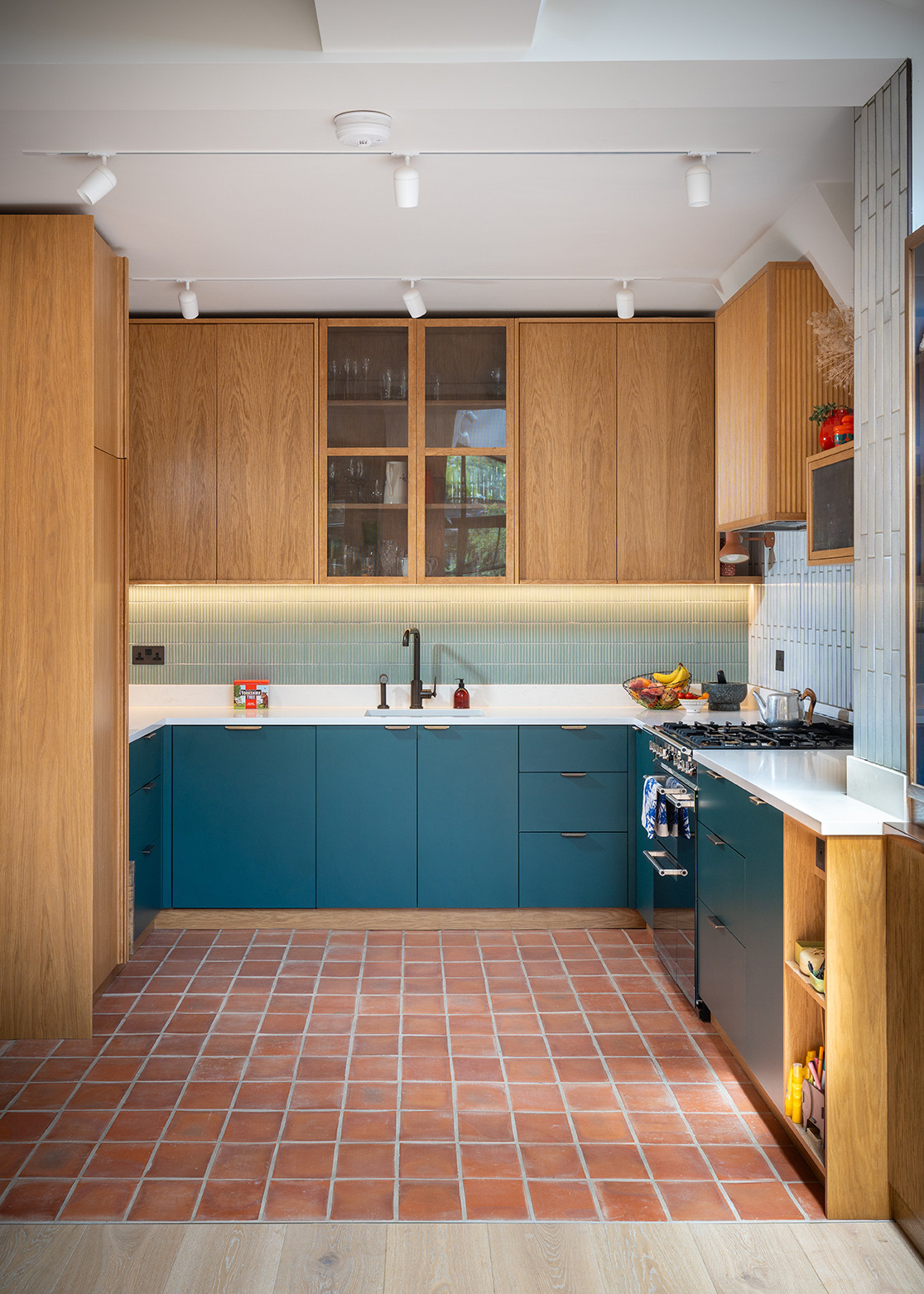 “The terracotta is used sparingly but playfully,” Johanna says. “As it reaches the kitchen, it goes from eye level to floor level, so you feel there’s a relationship, but it’s not in your face.”